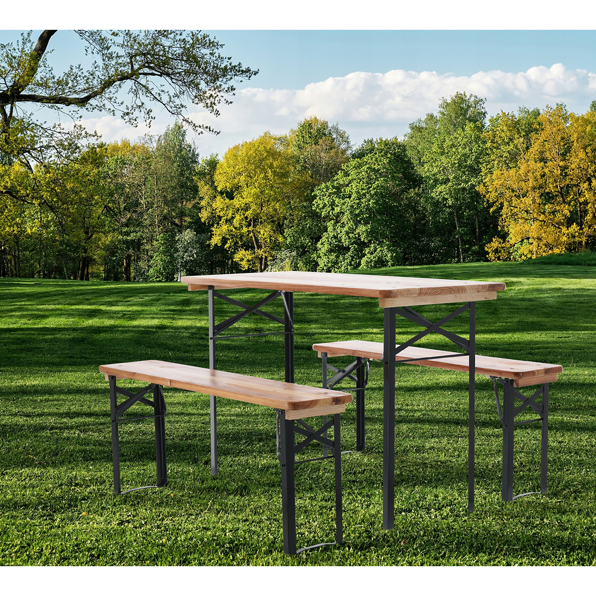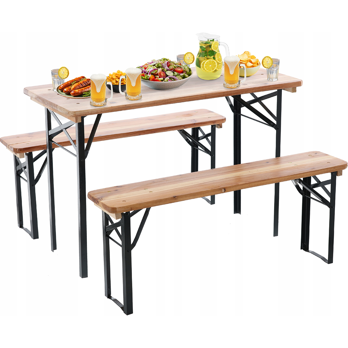 - Univerzálnost – set je ideální pro rodinné grilování, zahradní párty, festivaly či sezónní akce. Díky přirozené kresbě dřeva a ocelové konstrukci snadno zapadne do každé zahrady, na terasu i do areálů akcí