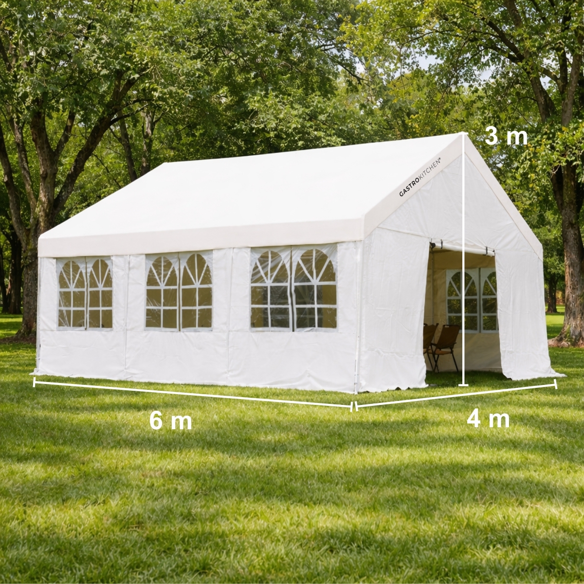 Profesionální párty stan 4 × 6 m (24 m2) s kapacitou až 47 stojících, 32 sedících na židlích nebo 28 hostů na lavičkách. Ideální řešení pro menší svatby, zahradní party, firemní cateringové akce nebo jako dočasný skladovací přístřešek.