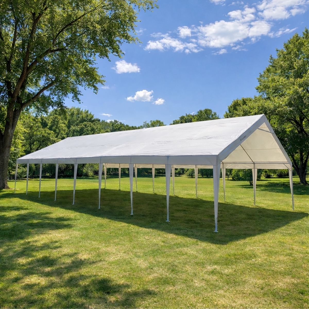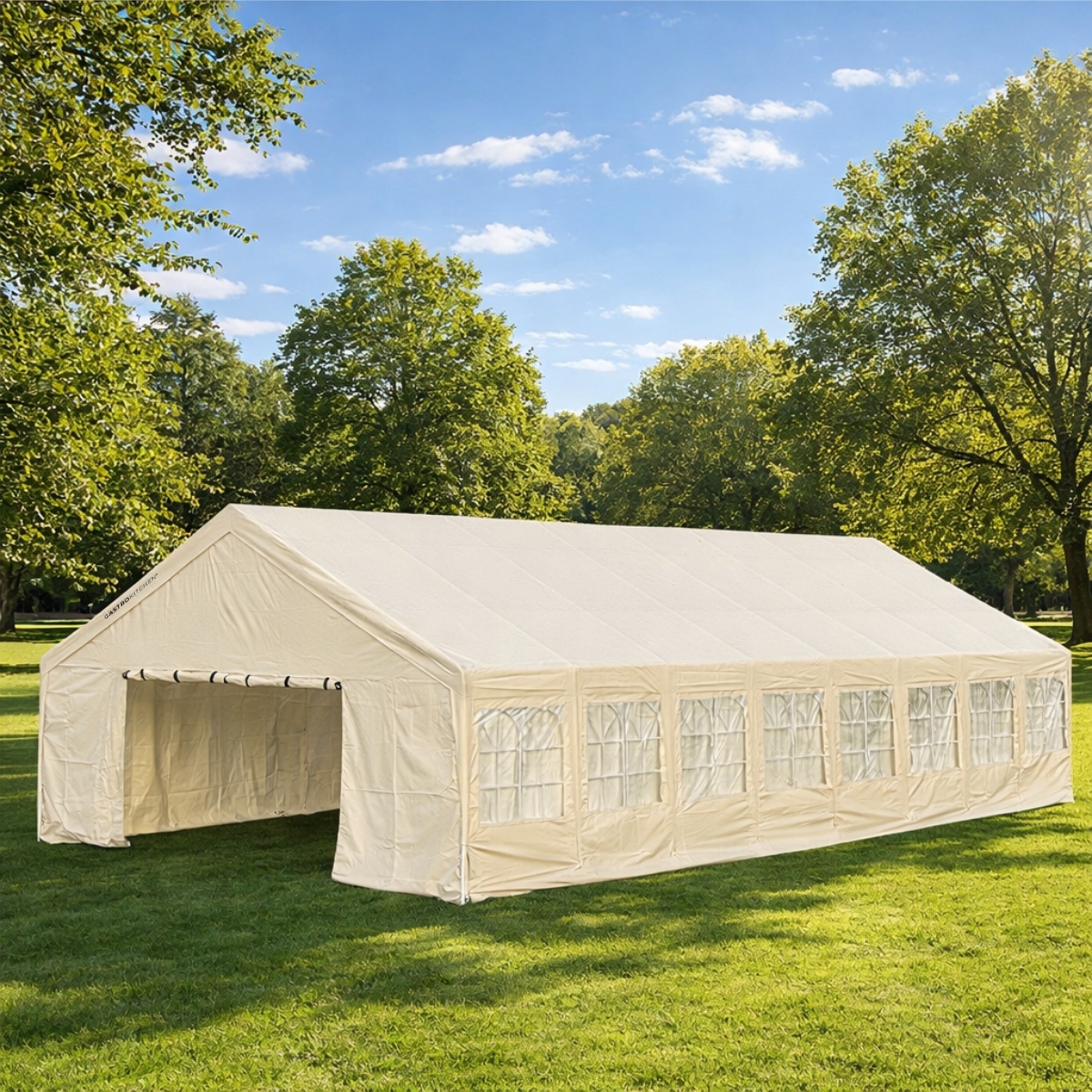 Profesionální párty stan 6 × 12 m (72 m²) s kapacitou až 140 stojících osob, 100 sedících nebo 94 hostů u lavicových párty setů. Ideální řešení pro svatby, festivaly, firemní cateringové akce nebo jako dočasný skladový přístřešek. Lakovaná bílá ocelová konstrukce Ø 38 mm / spojky Ø 42 mm zajišťuje výbornou stabilitu i v náročných povětrnostních podmínkách.
