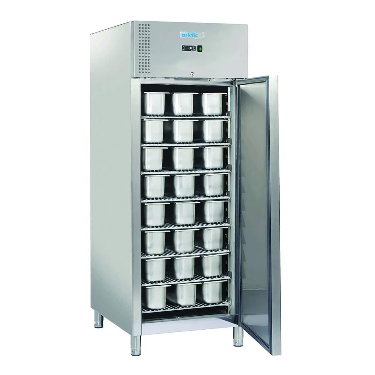 Profesionální mrazicí skříň – 800 L | Arktic 236819 s objemem až 800 litrů je ideálním řešením pro profesionální kuchyně, cukrárny i další gastronomická zařízení, která vyžadují spolehlivé a efektivní skladování mražených produktů. Robustý vnější plášť z nerezové oceli a vnitřní prostor s 10 lištami zaručují vysokou odolnost, snadnou údržbu a pohodlné používání.