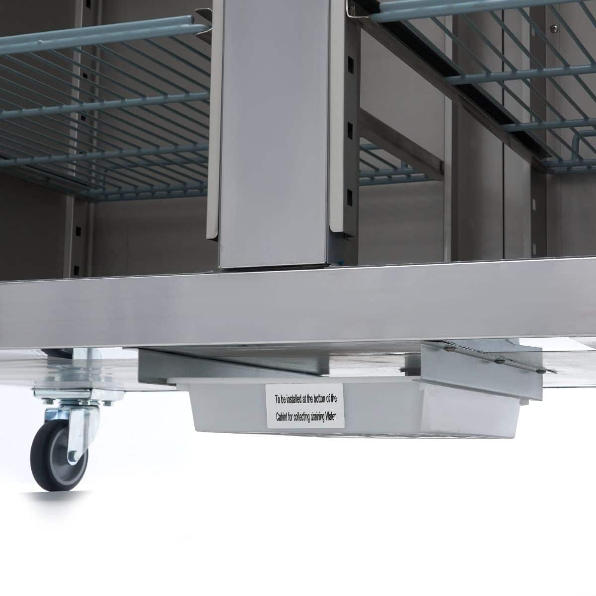 Je také vybavena odkapávací miskou, ve které se shromažďuje přebytečná voda. Mrazničku podpírají čtyři kolečka pro snadnou mobilitu, z nichž dvě mají brzdy pro zajištění její polohy.