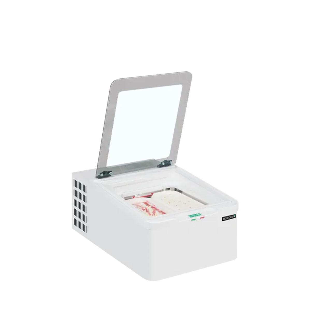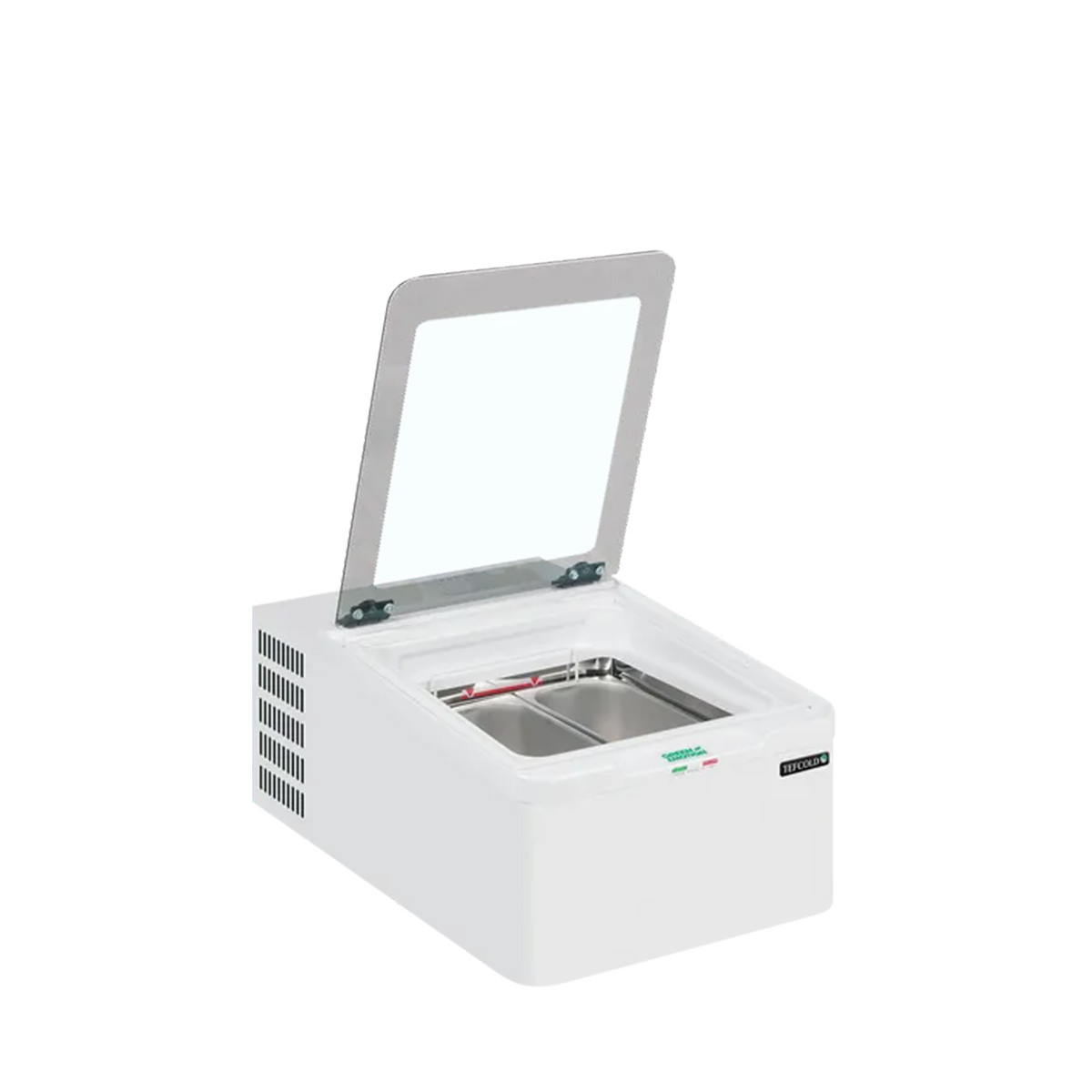Distribuátor kopečkové zmrzliny | TEFCOLD ICE2 je kompaktní pultové mrazicí zařízení určené pro profesionální prezentaci a výdej kopečkové zmrzliny v gastro provozech. Nakloněná výstavní plocha zlepšuje viditelnost příchutí a umožňuje rychlý přístup při obsluze. Statické chlazení v teplotním rozsahu -22 °C až -10 °C zajišťuje stabilní podmínky pro zachování kvality zmrzliny během prodeje.