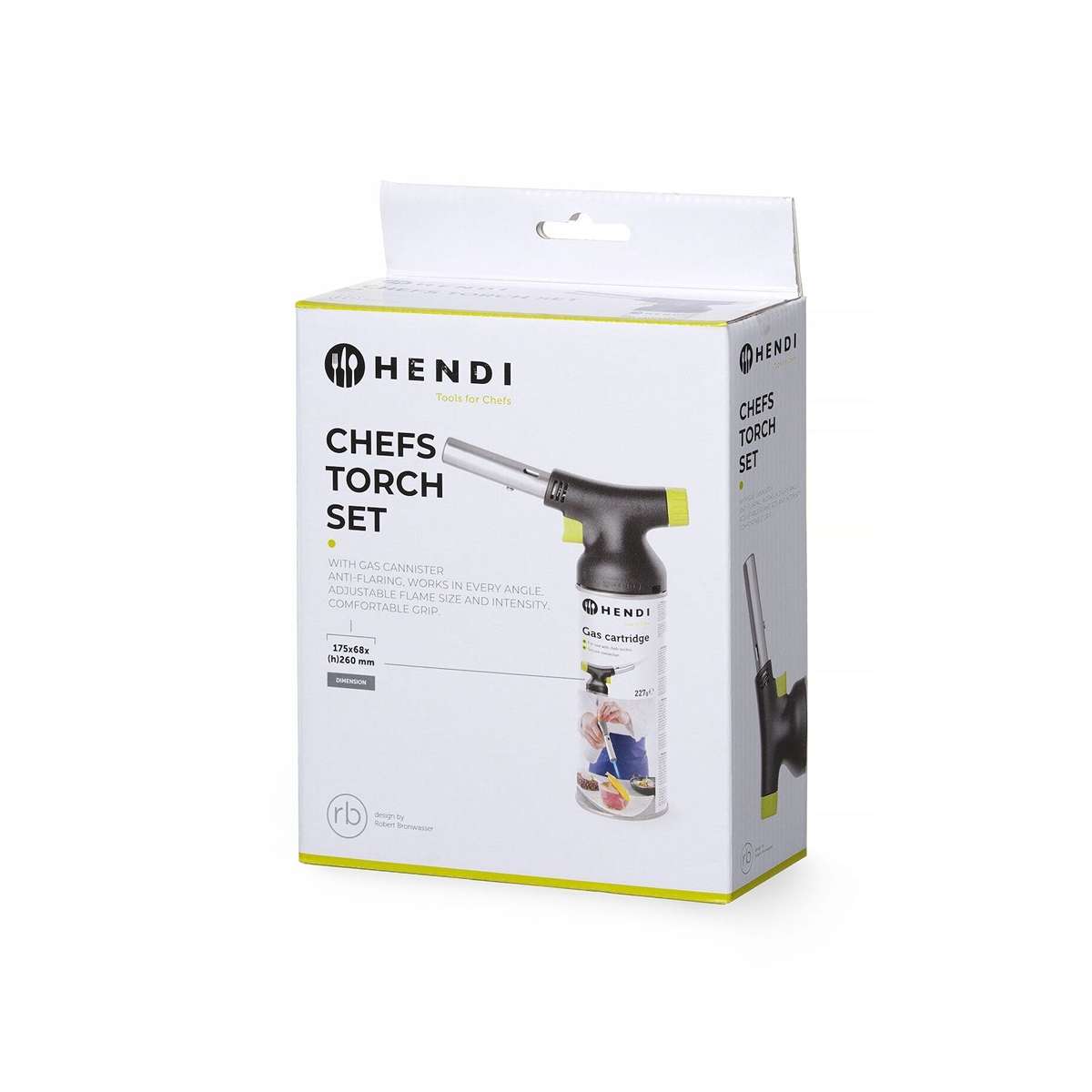 Flambovací pistole – 175 mm | Hendi 198254 s moderním designem je navržena designérem Robertem Bronwasserem. Pistole vytváří rovnoměrný plamen ve všech polohách díky čemuž pomáhá vždy dosáhnout perfektního vzhledu podávaných pokrmů.