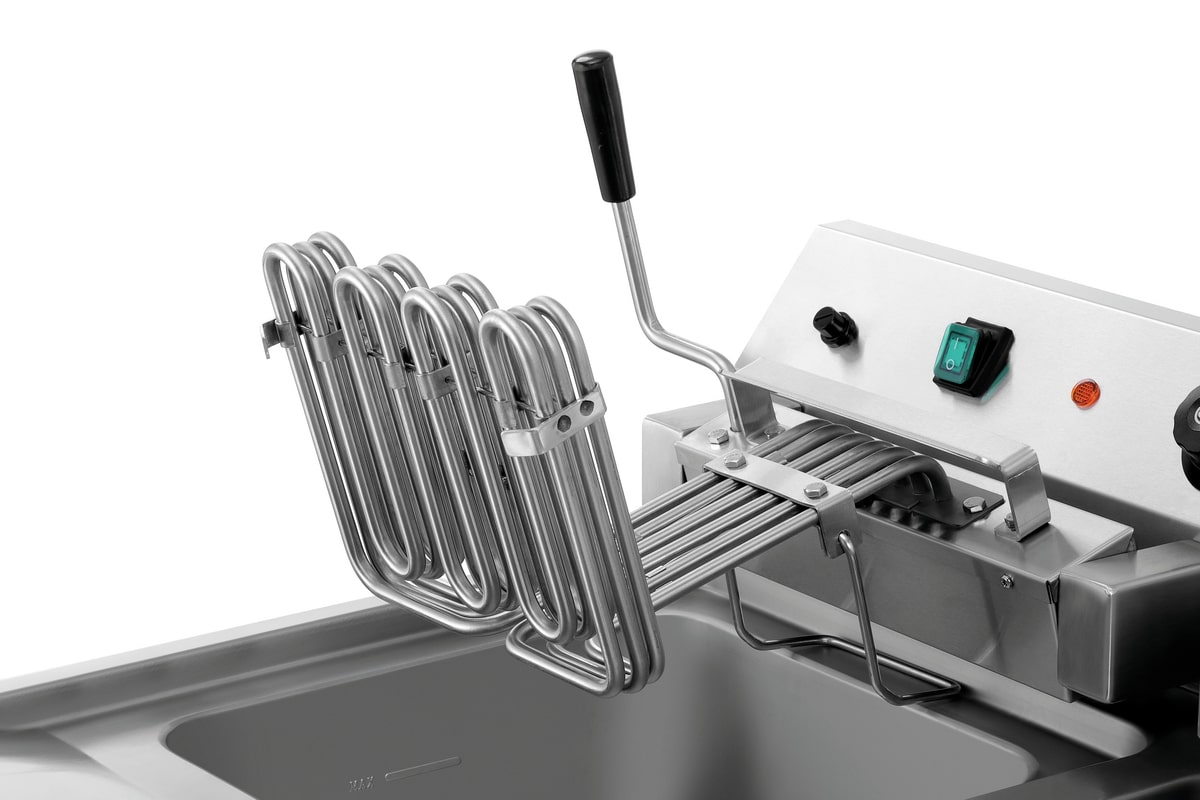 Elektrická fritéza – 1×12 L | Bartscher 162650 je robustní stolní spotřebič s 12litrovou nádobou a je ideální pro použití ve velkých profesionálních kuchyních. Kohoutek na vypouštění tuku, vyjímatelné panádové síto a výkyvné topné těleso umožňují snadné čištění.