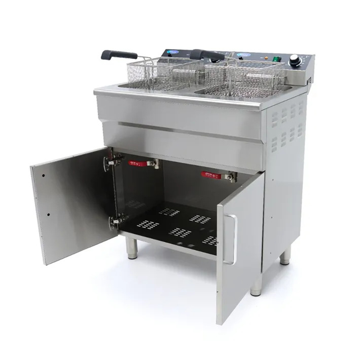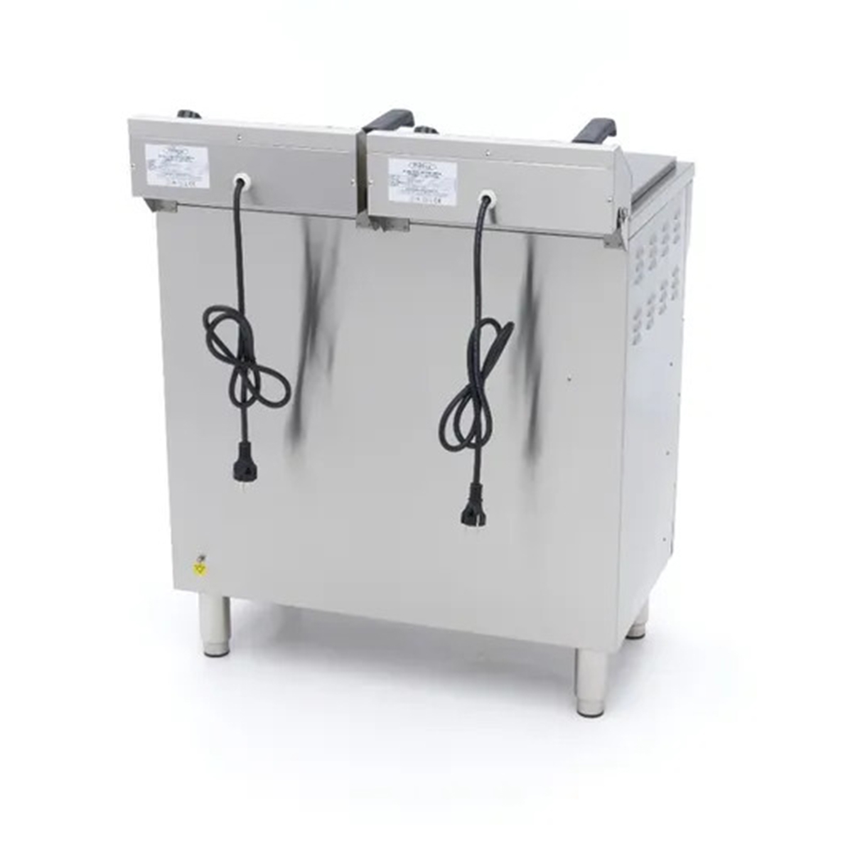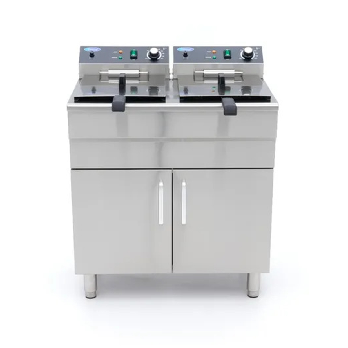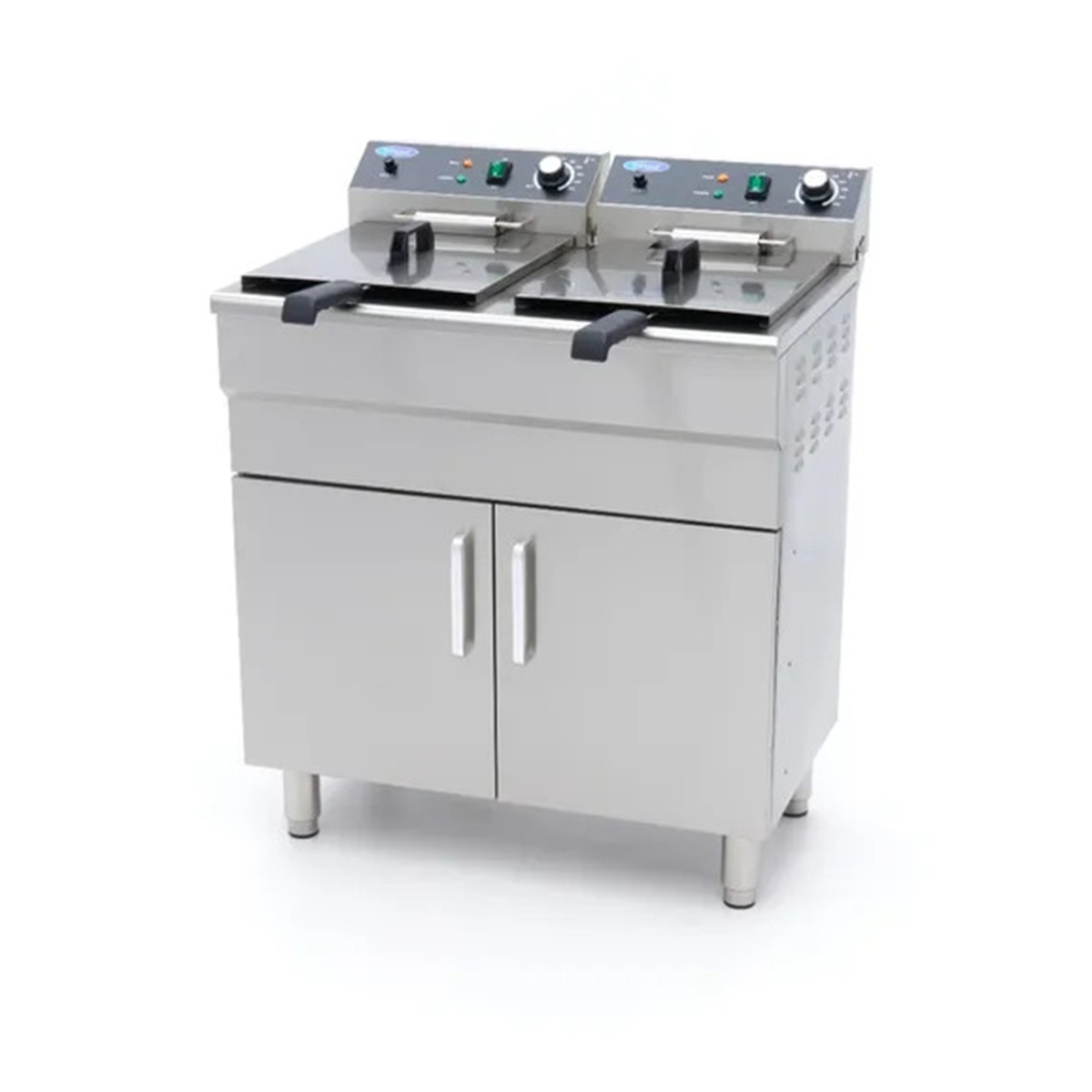 Elektrická fritéza 2×16 l – 230 V + spodní skříňka | 09365158 je určena pro restaurace, bary, jídelny a pod. Díky svému velkému objemu je ideální pro smažení většího množství potravin, díky čemuž bude neocenitelným pomocníkem v každé rušné kuchyni.