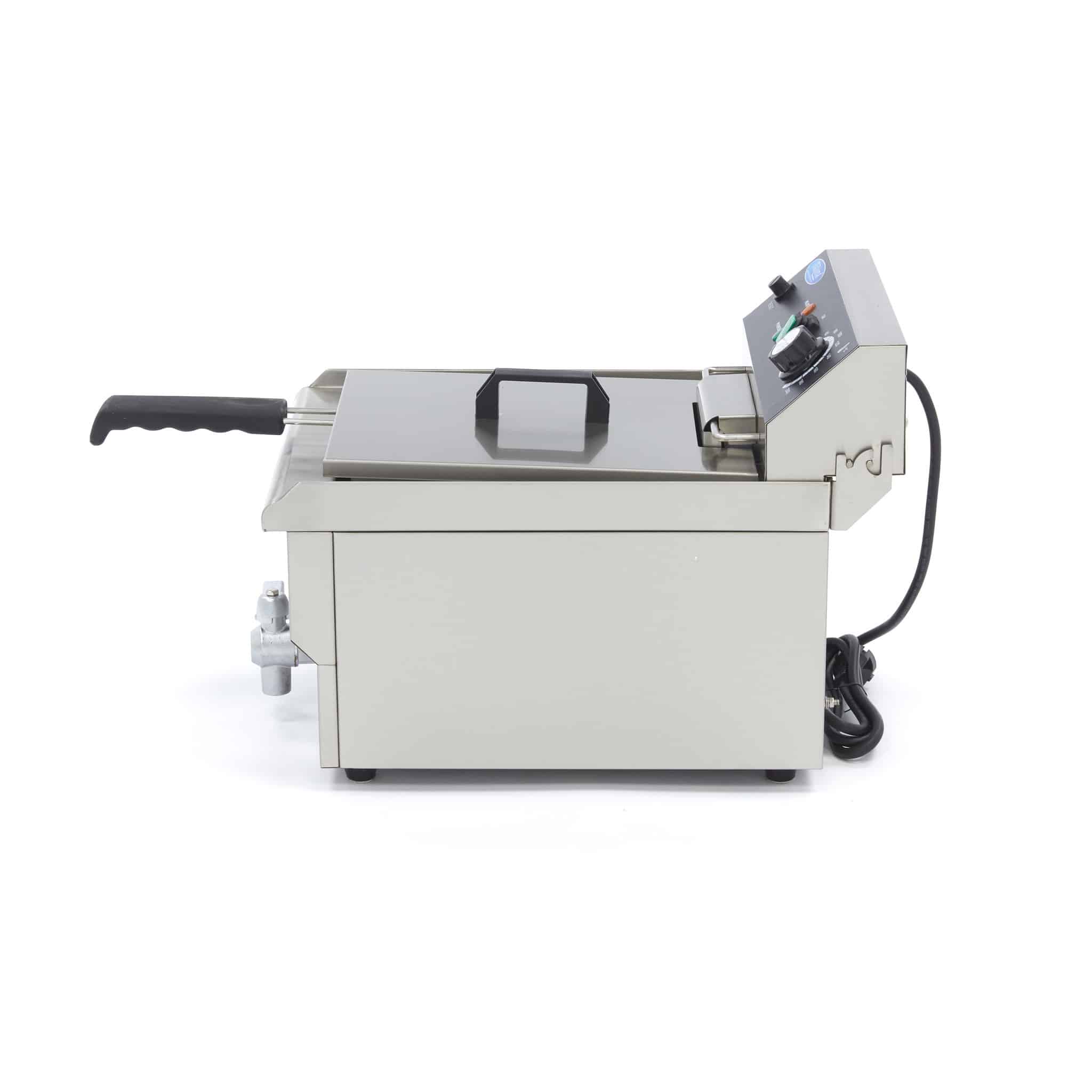 - Fritéza 13 L je úhledně zakončena zaoblenými rohy a opatřena víkem, aby se zabránilo rozstřikování oleje.