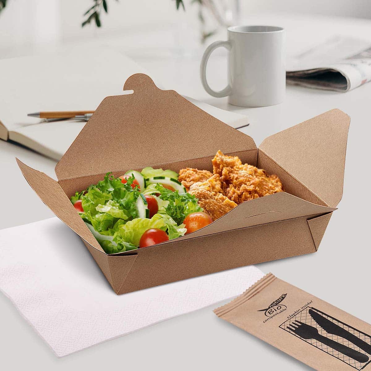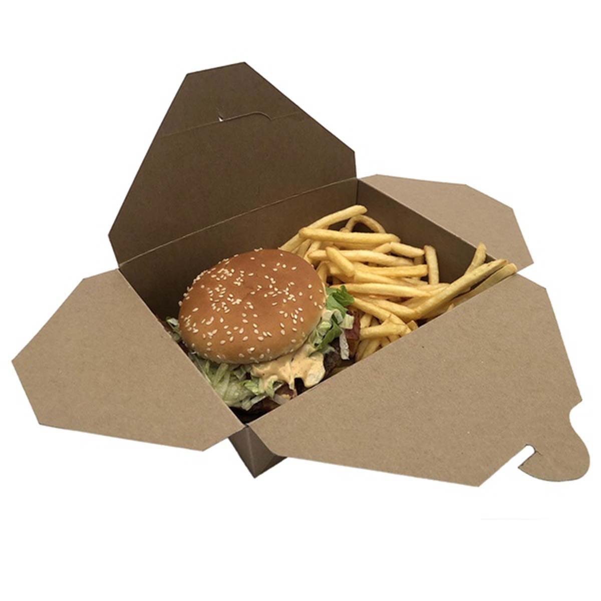 Tento food box je ideálním řešením pro restaurace, bufety i donáškové služby, které hledají ekologickou alternativu k tradičním plastovým obalům. Box je vyroben z kvalitního kraftového papíru s vrstvou z polyethylenu, která zajišťuje jeho odolnost vůči vlhkosti a mastnotě. Nepromastitelná vrstva chrání jídla před navlhnutím a zabraňuje vzniku mastných fleků.