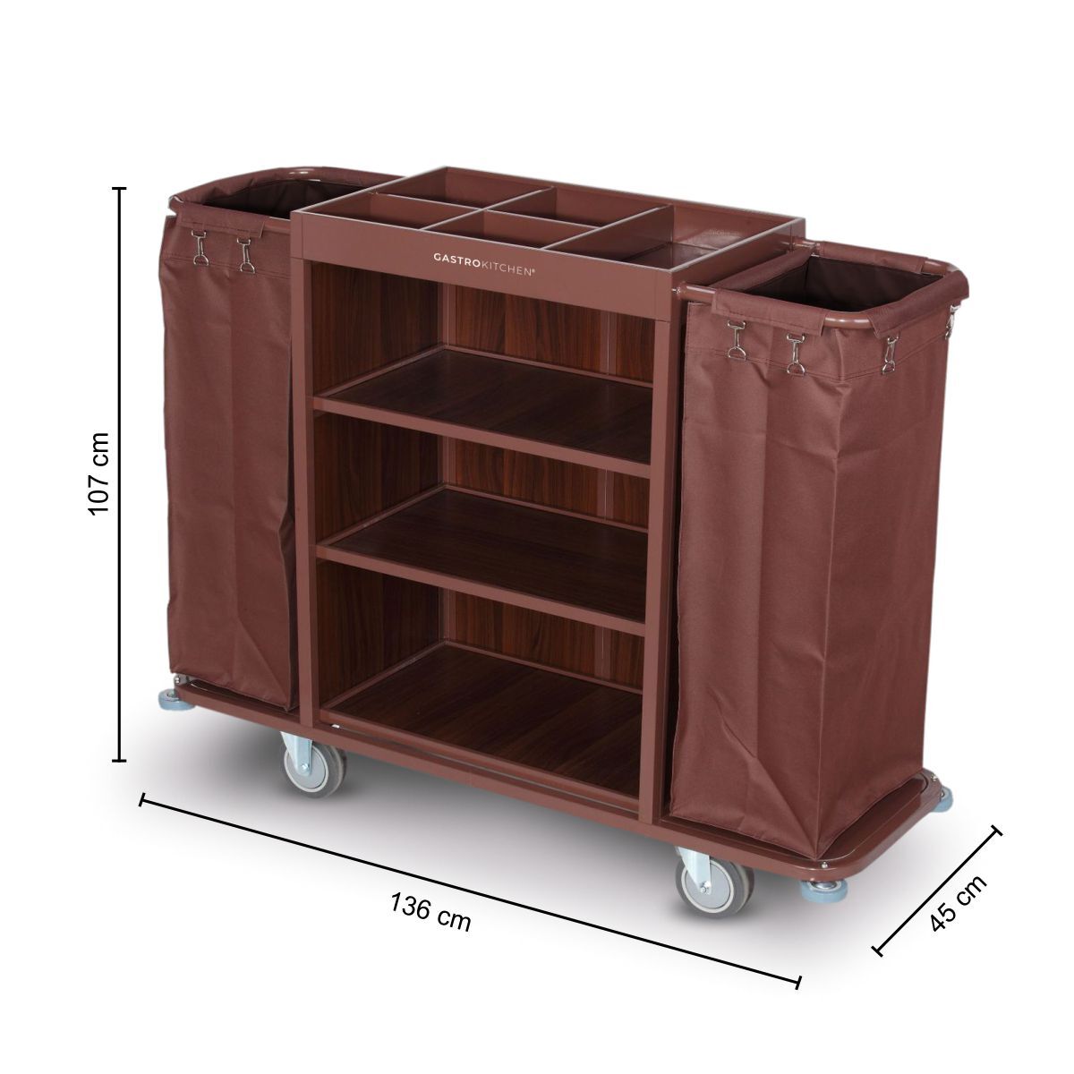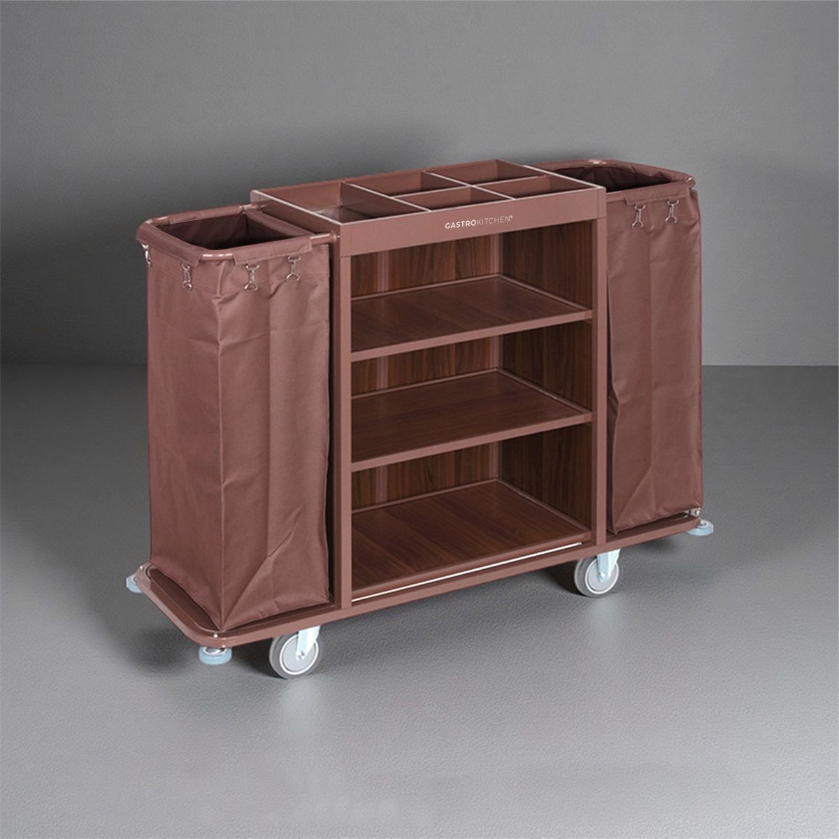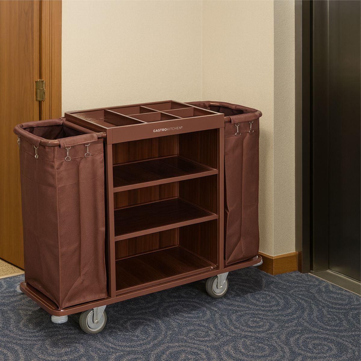 Hotelový vozík – hnědý je praktický a stabilní pomocník určený pro hotelový a úklidový personál. Umožňuje snadný převoz prádla, ručníků, čisticích prostředků a doplňků v hotelech, penzionech či ubytovacích zařízeních.