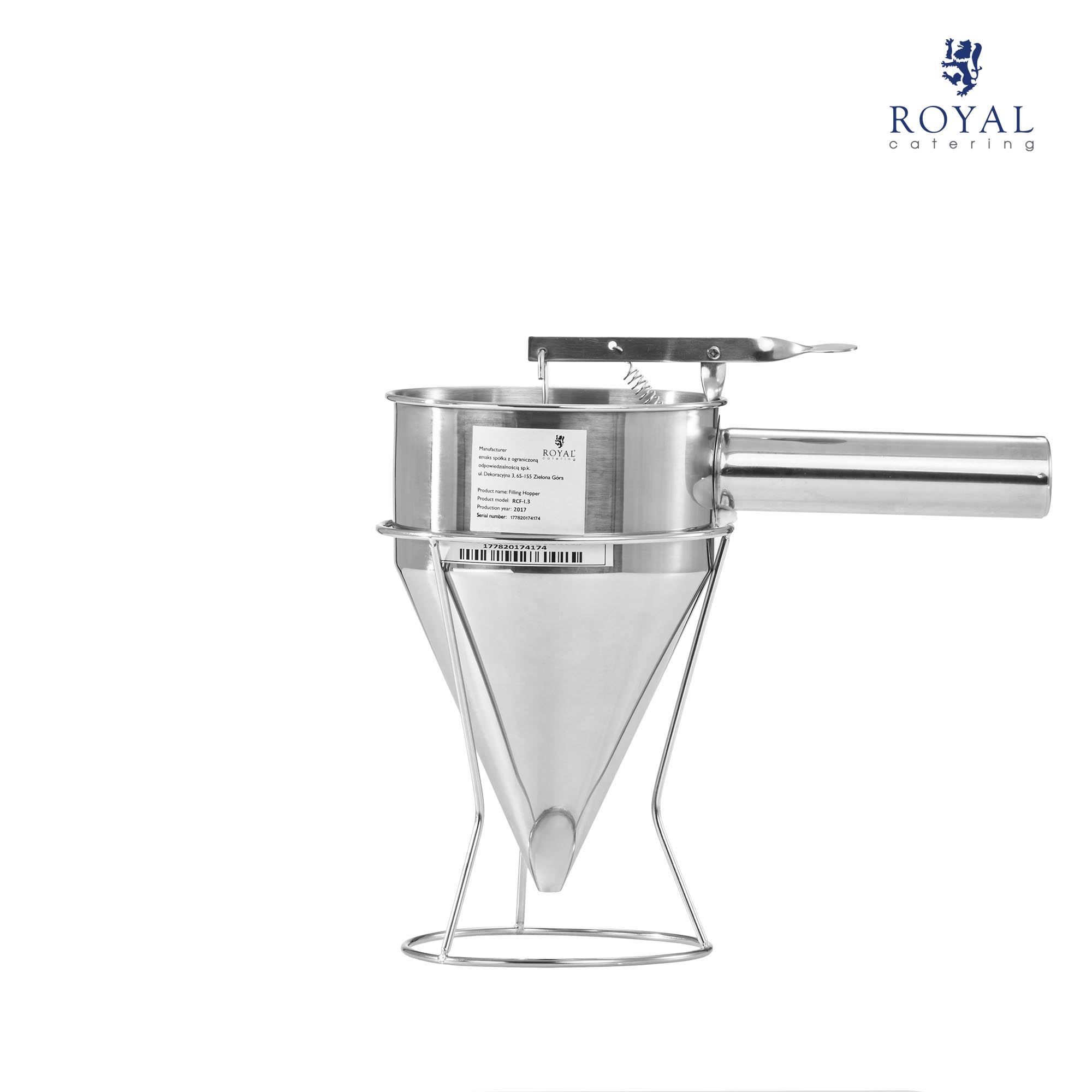 Plnicí trychtýř – 1,3 L | RCFT-1.3 s označením 10010648 je určen pro profesionální použití v cukrárnách, pekárnách, restauracích, kavárnách atd. Dobře funguje také v soukromé kuchyni. Model RCFT-1.3 je vhodný pro zalévání (např. vaflí, palačinek) různých polév a ovocných pěn. Zařízení od Royal Catering se vyznačuje trvanlivostí a pevným výkonem.