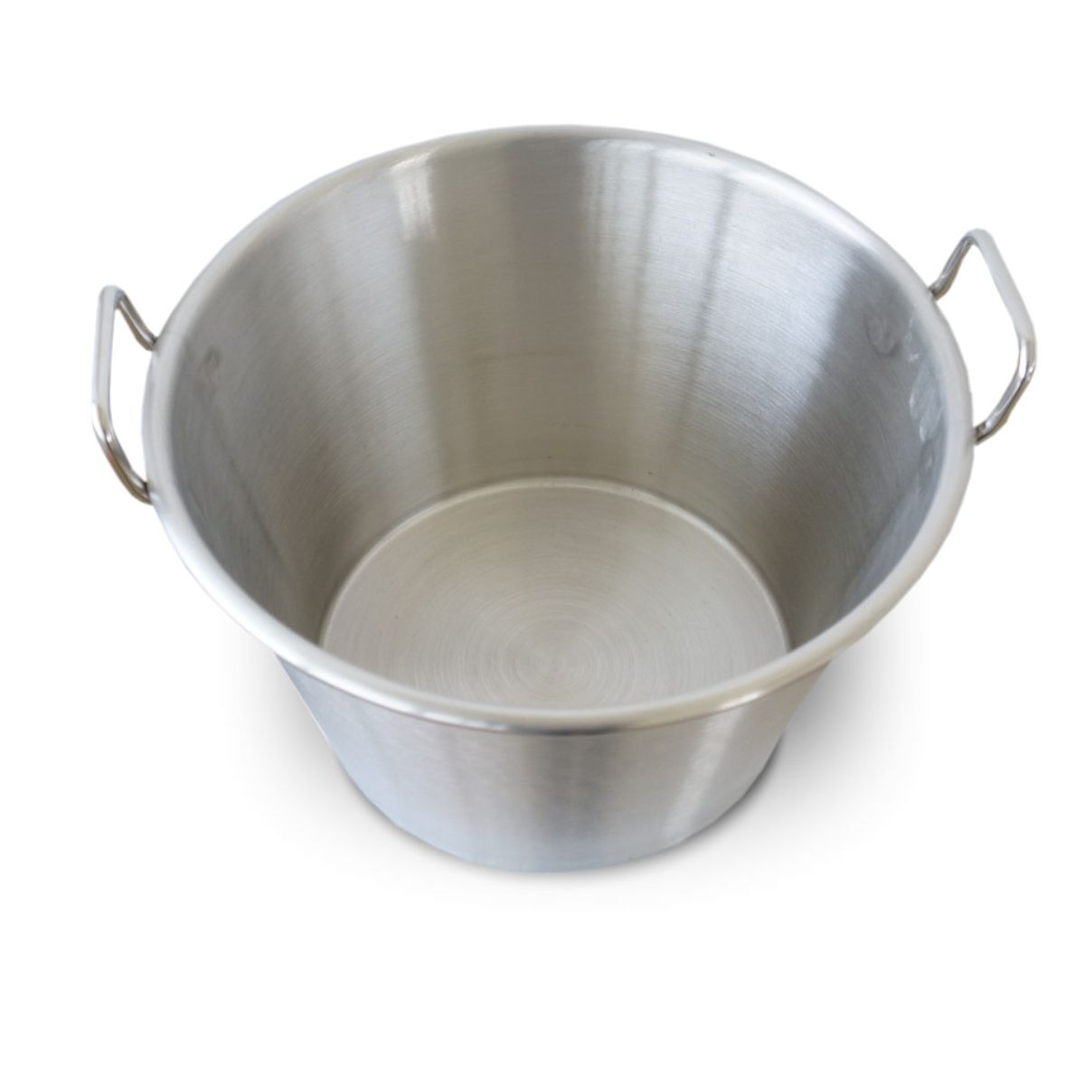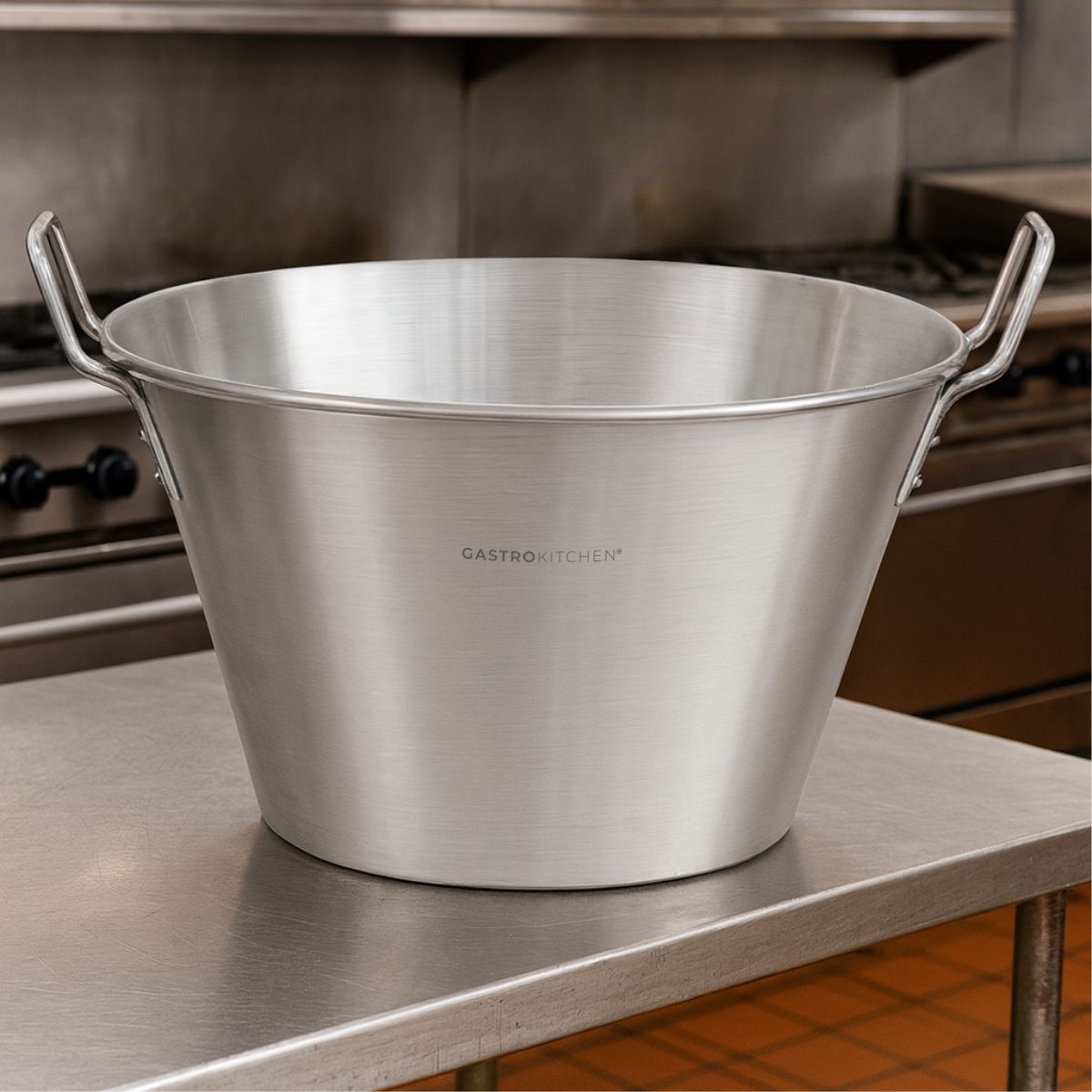 Vyrobena z nerezové oceli 201 – odolná, snadno udržovatelná a s dlouhou životností. Kónický tvar zajišťuje stabilitu a pohodlnou manipulaci při práci, zatímco pevné rukojeti umožňují bezpečné přenášení i při plném objemu.