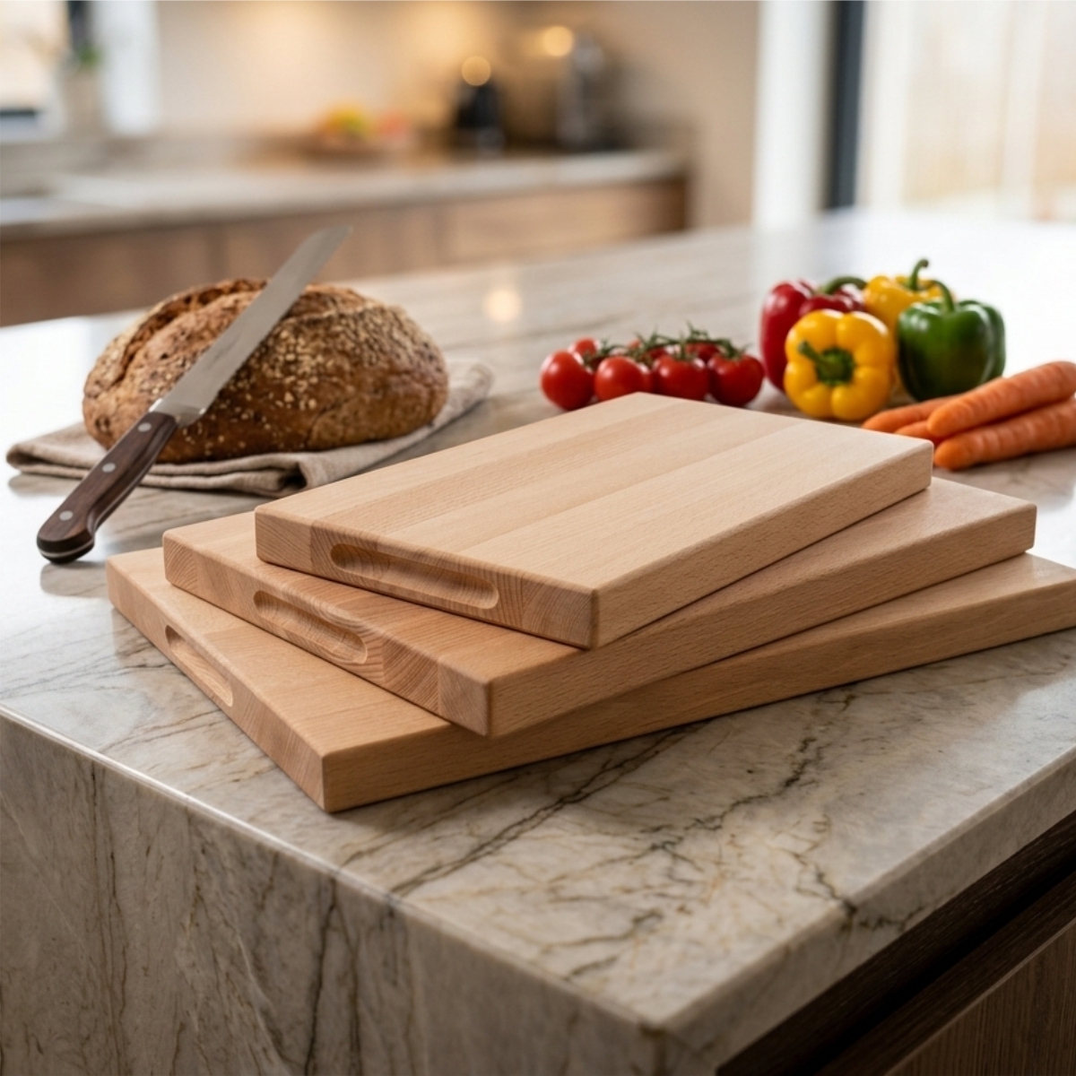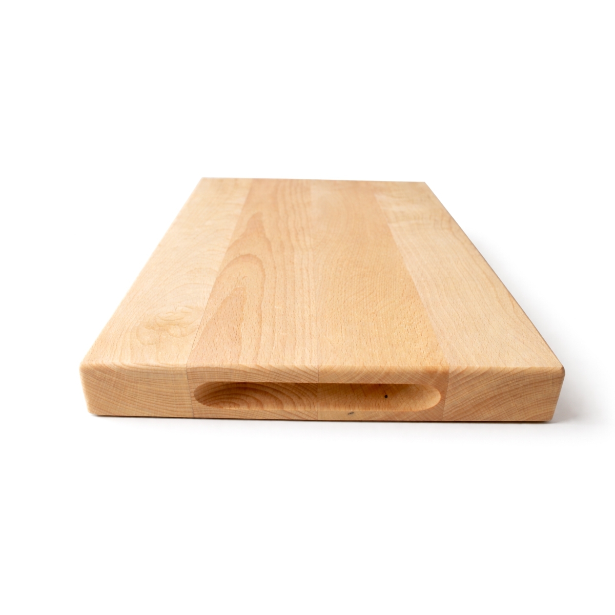 Boční úchopy usnadňují přenášení a manipulaci, zatímco povrch ošetřený jedlým olejem pomáhá chránit dřevo při běžném používání a zvýrazňuje jeho přirozenou kresbu.