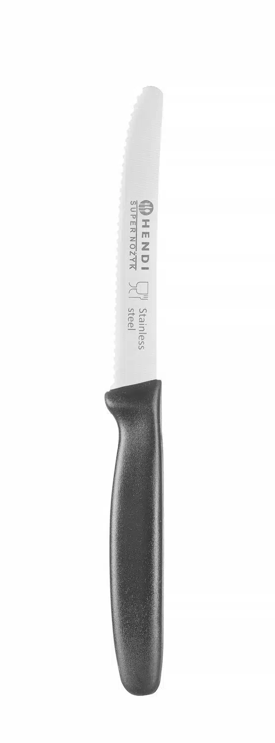 Univerzální nůž – 220 mm – černý | Hendi 842089 je každodenní nástroj pro každého šéfkuchaře. Jeho klasický tvar umožňuje velmi pohodlné používání a jeho ostrá vroubkovaná čepel hladce prořízne různé druhy zeleniny, ovoce, sýra nebo chleba bez uklouznutí nebo drcení produktu.