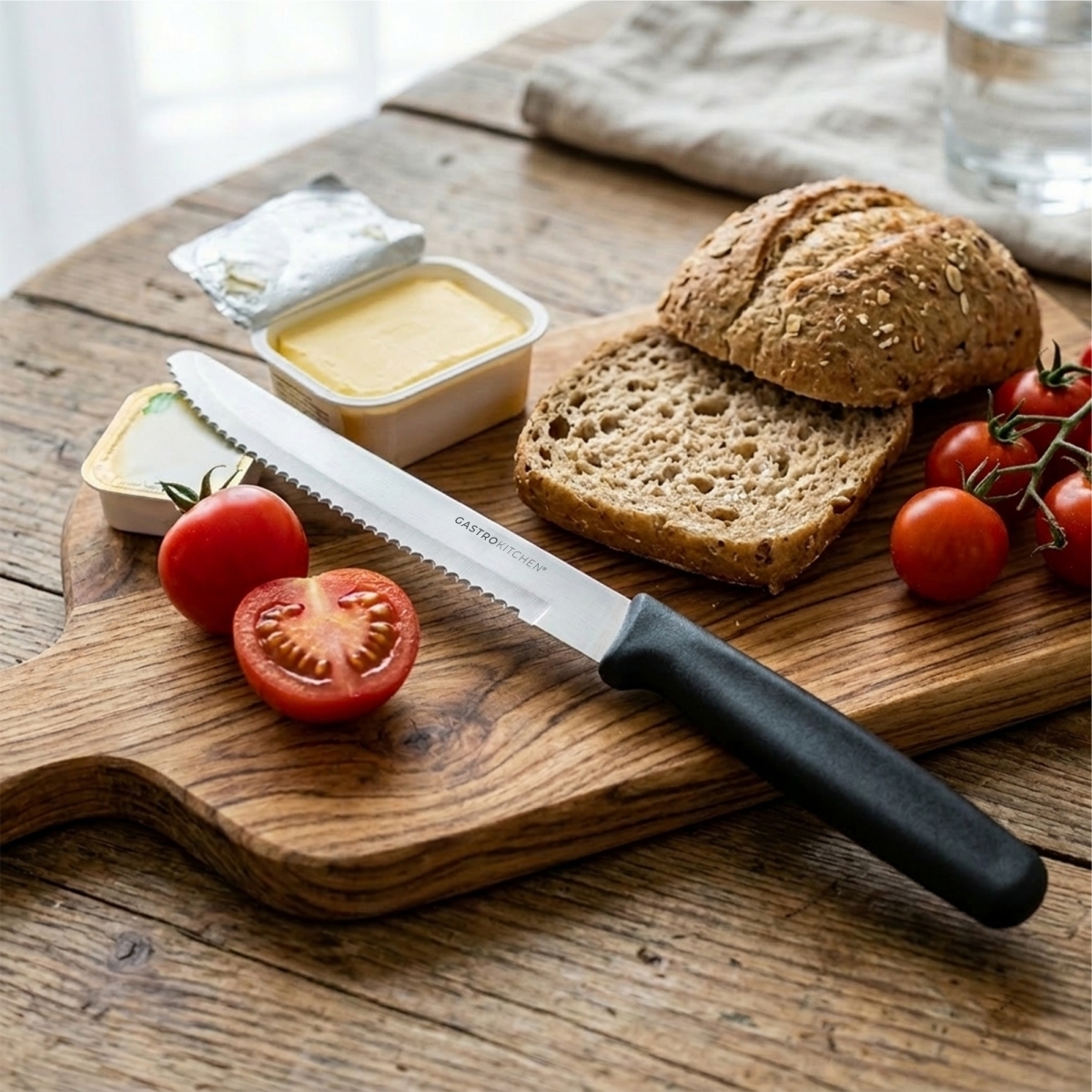 Kuchyňský zoubkovaný nůž z nerezové oceli je praktickým pomocníkem pro každodenní krájení pečiva, zeleniny, ovoce i dalších surovin. Vroubkovaná čepel s mikro-zoubky usnadňuje přesný řez, snadno si poradí s kůrkou i slupkou a zároveň pomáhá zachovat jemný střed krájených potravin. Zaoblená špička přispívá k bezpečnější manipulaci a ergonomická černá rukojeť zajišťuje pohodlný úchop při práci.