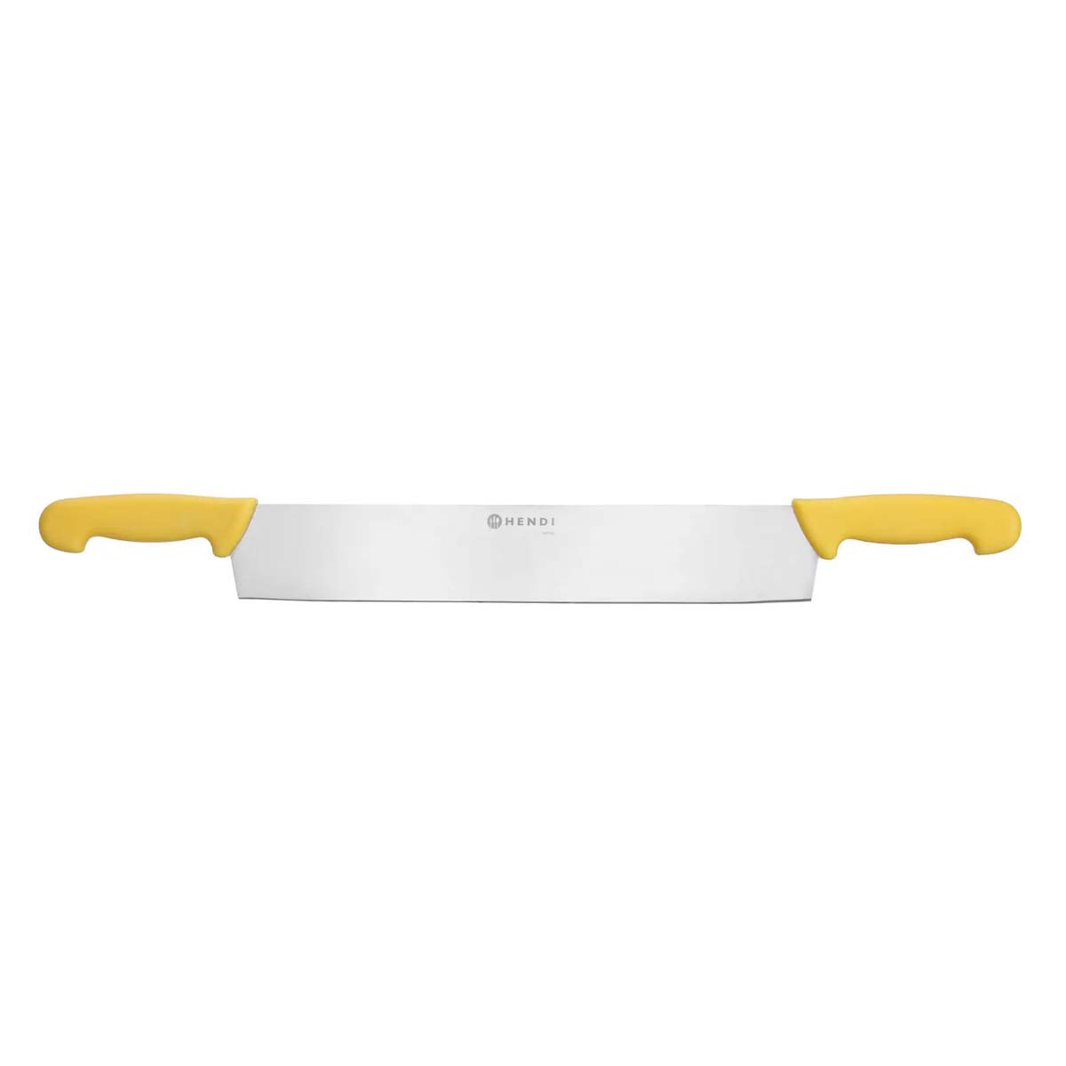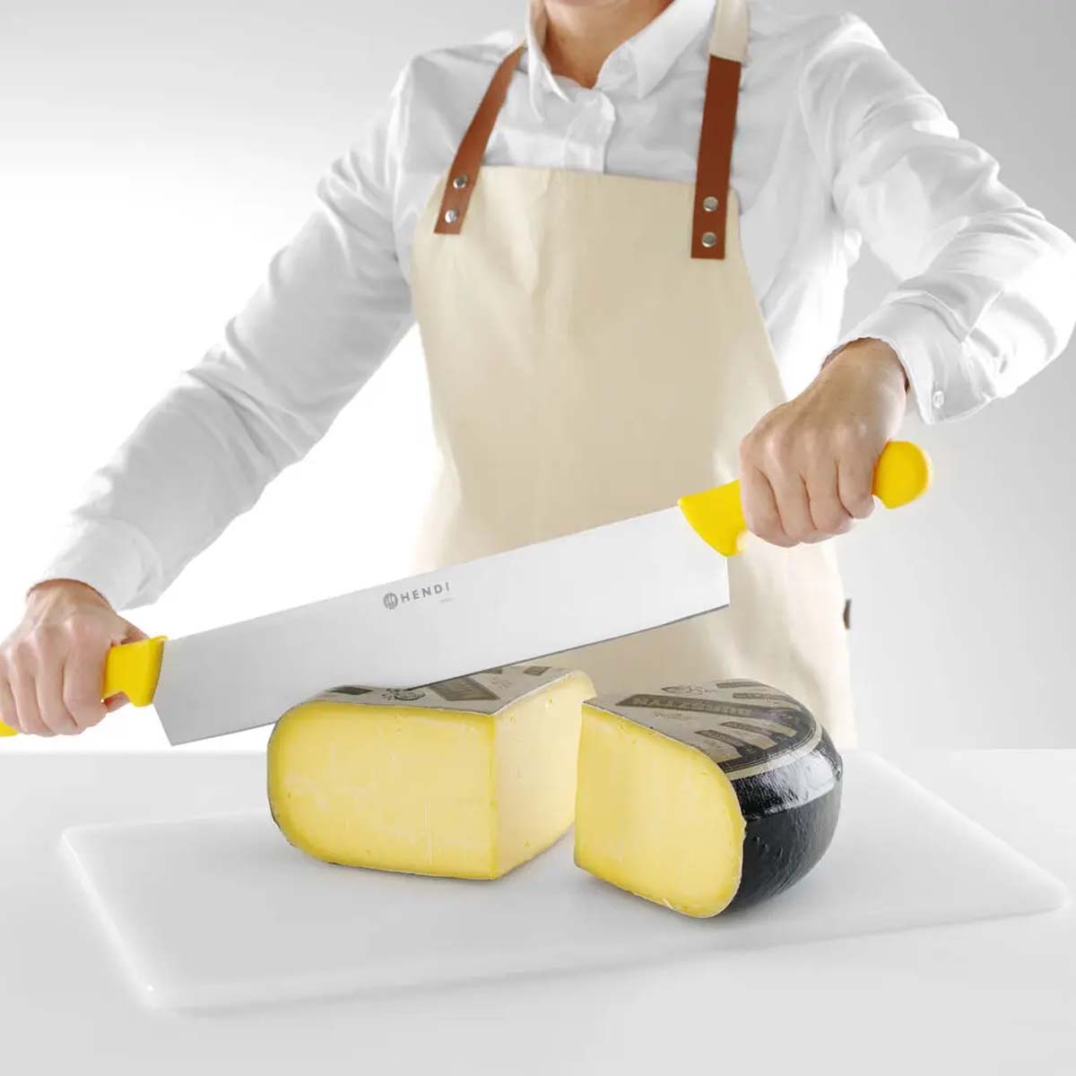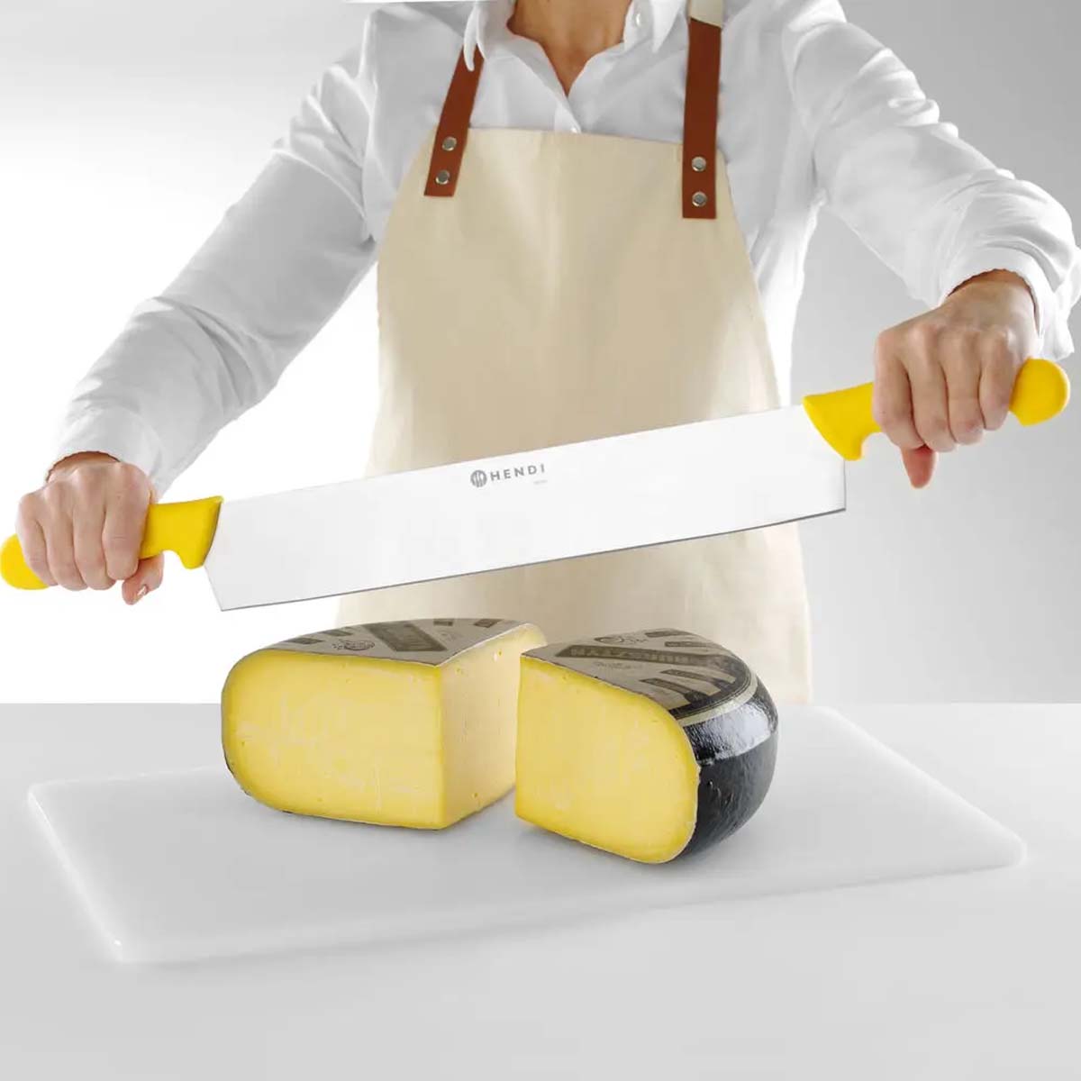 Nůž na sýry s dvojitou rukojetí – 655 mm | Hendi 856413 je určen ke krájení velkých bochníků sýra v restauracích, jídelnách, hotelích a pod. Ostrá čepel nože z nerezavějící oceli usnadňuje krájení tvrdých sýrů.