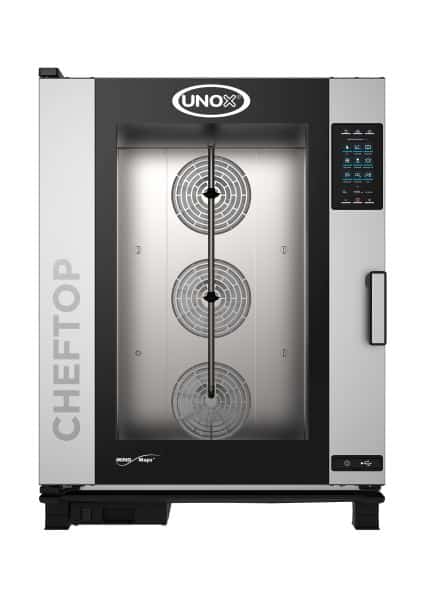 Plynový parní konvektomat UNOX ChefTop MindMaps Plus 10×2/1 GN nebo 20x GN 1/1 je to moderní kuchyňské zařízení zvláště doporučené pro profesionální gastronomii. Konvektomat umožňuje přípravu v suchém, horkém vzduchu nebo s využitím funkce páry.