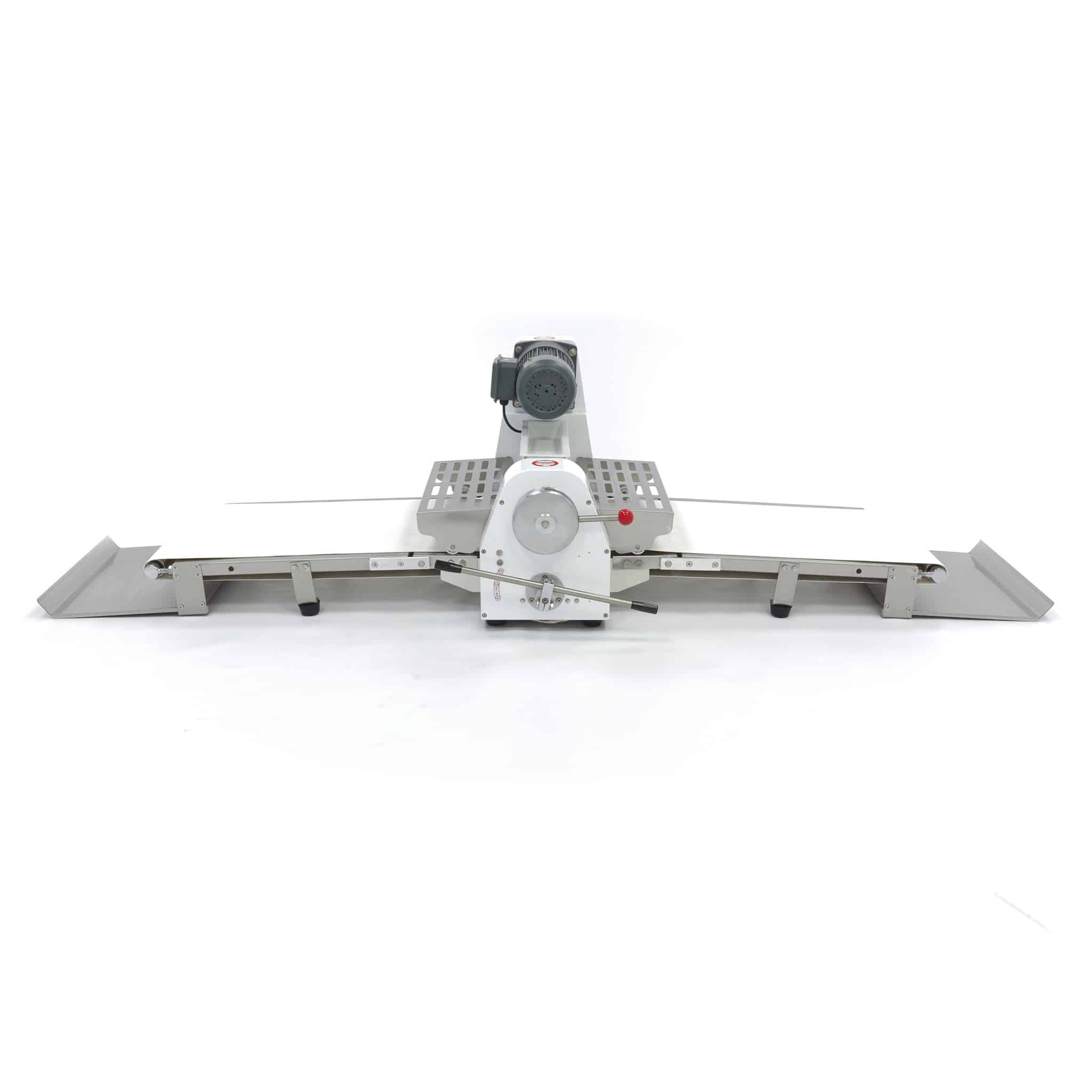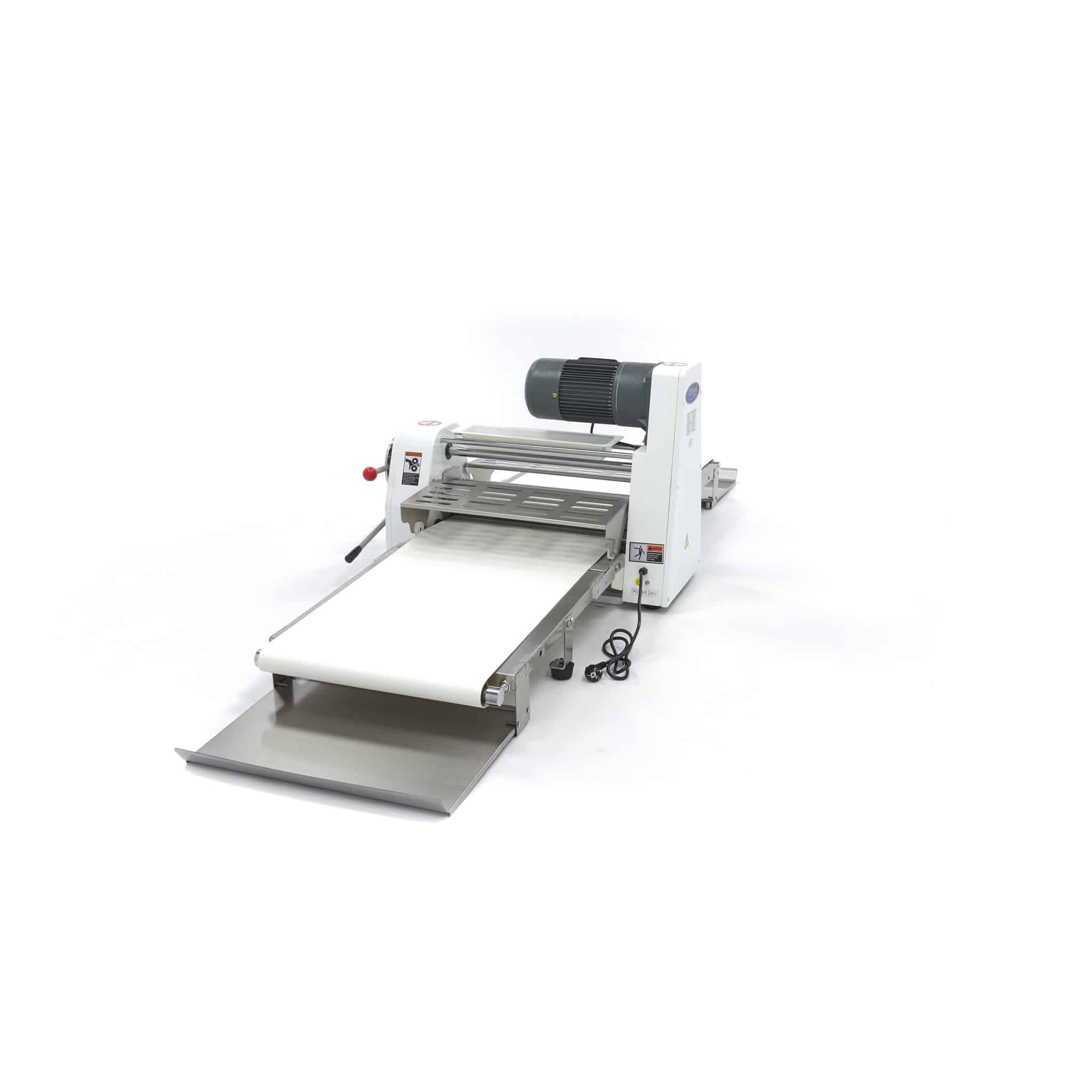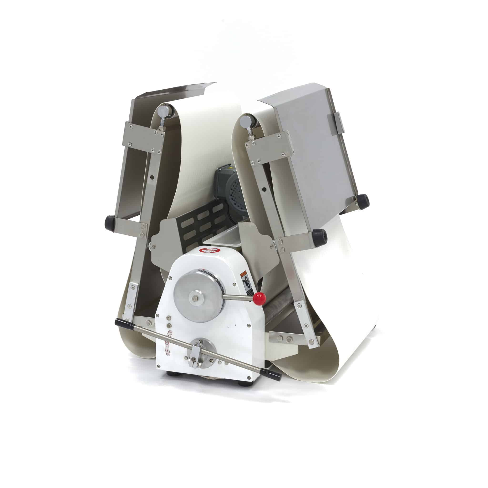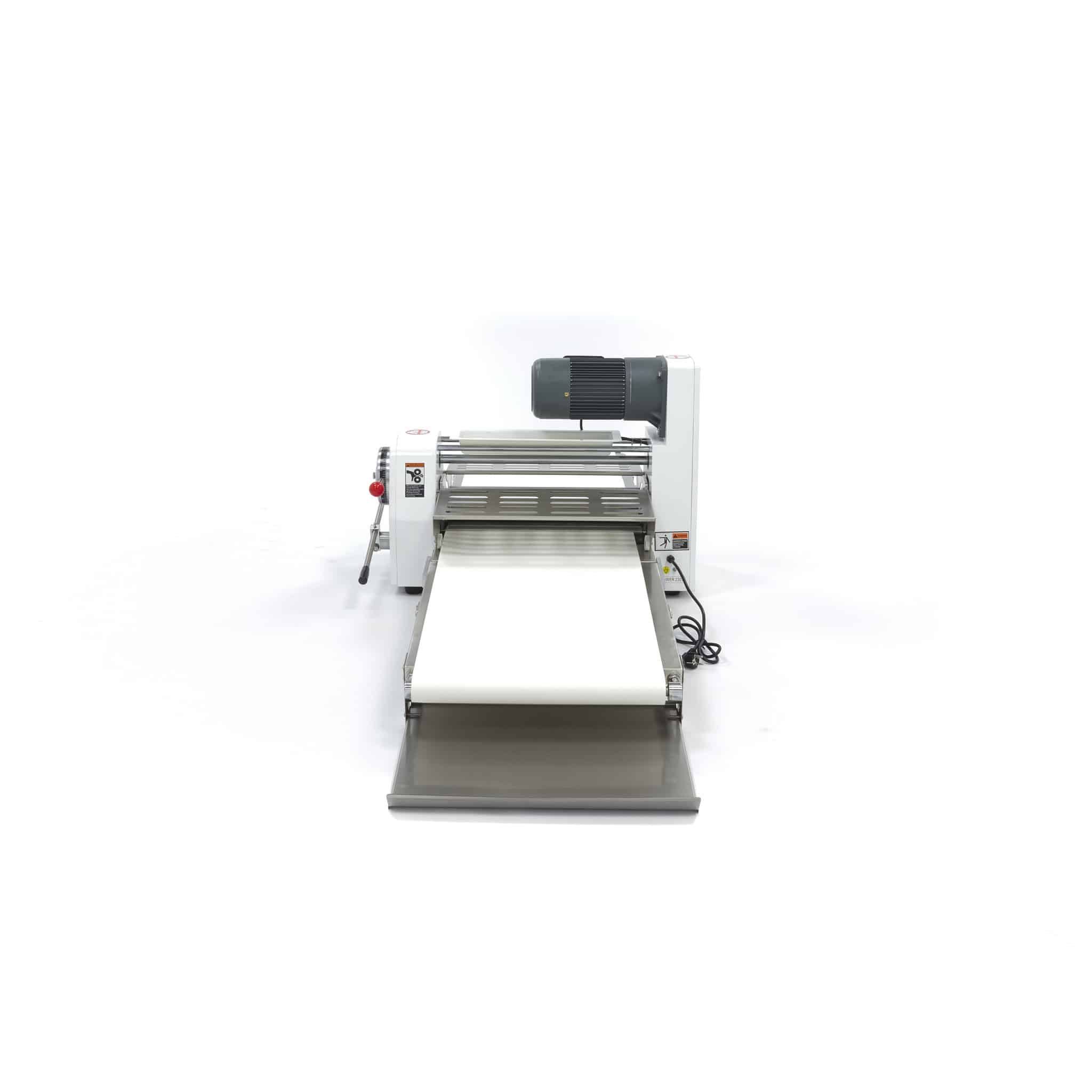 Stroj na válení těsta je vhodný pro profesionální použití a zaručuje snadné vyválení těsta. Pokud máte omezený prostor, je tento stolní model ideálním řešením. Na vrchní části válcovacího stroje na těsto je nádoba na mouku, která zabraňuje přilepení těsta na dopravní pás. Těsto dáte na dopravní pás, který je speciálně vyrobený na zpracování potravin. Potom horní pákou nastavte správnou tloušťku těsta. Dolní rukojetí vyválíte těsto přes váleček na druhou stranu. Takto se těsto rychle a rovnoměrně rozvaluje na správnou tloušťku. Stroj na válení těsta je snadno ovladatelný a stroj se také snadno čistí.