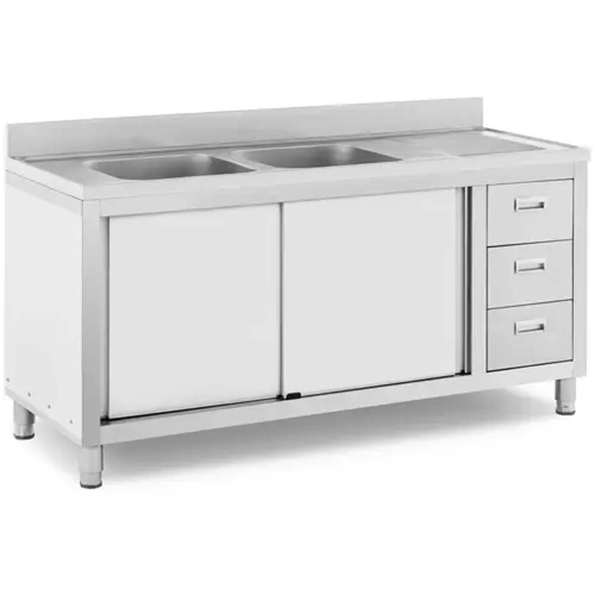 Skříňka s dřezem od výrobce Royal Catering, která byla navržena pro mytí, oplachování a dezinfekci kuchyňského náčiní a pod. Model RC-IKS04 bude dobře fungovat v restauracích, barech, hotelech, kavárnách, školách, nemocnicích a laboratořích.