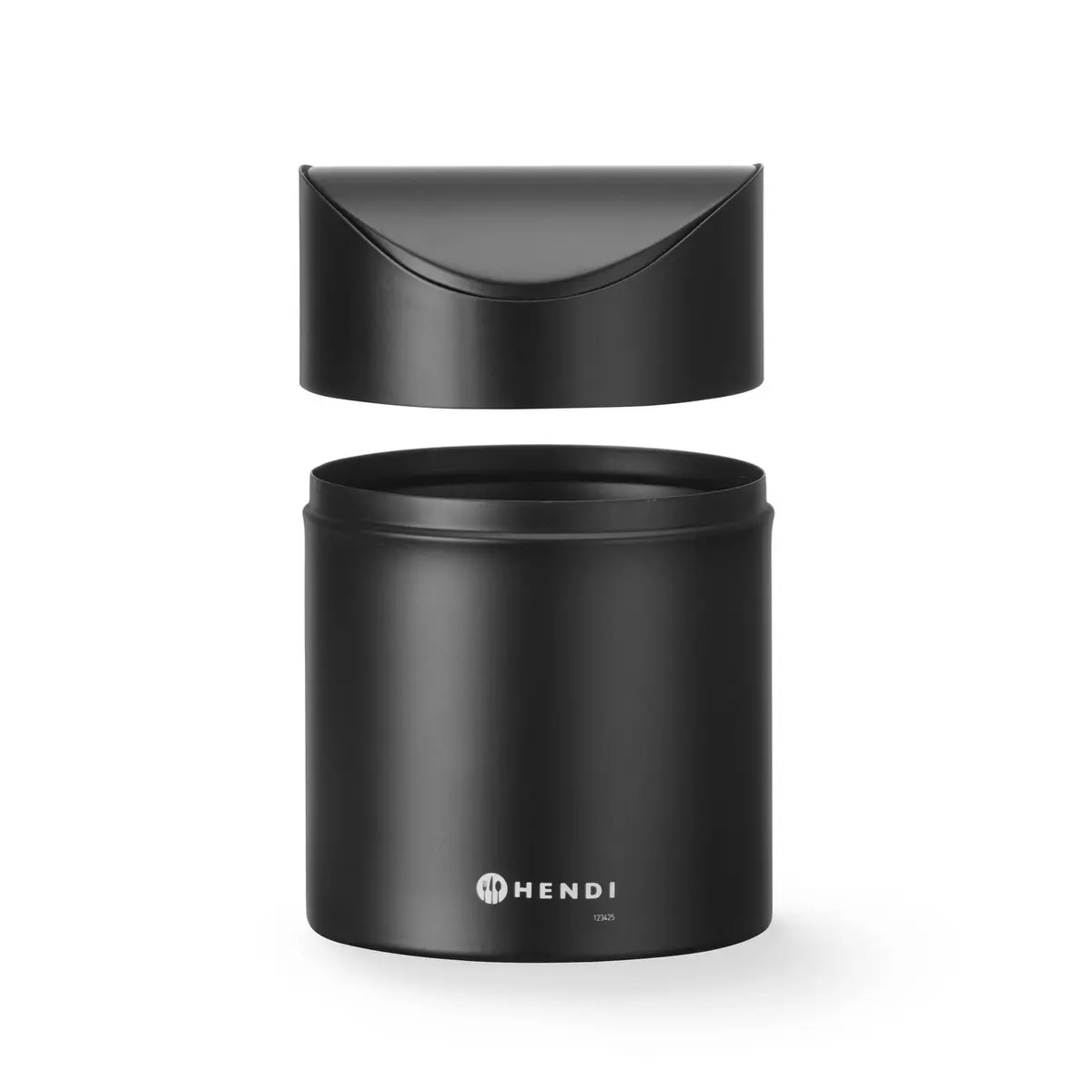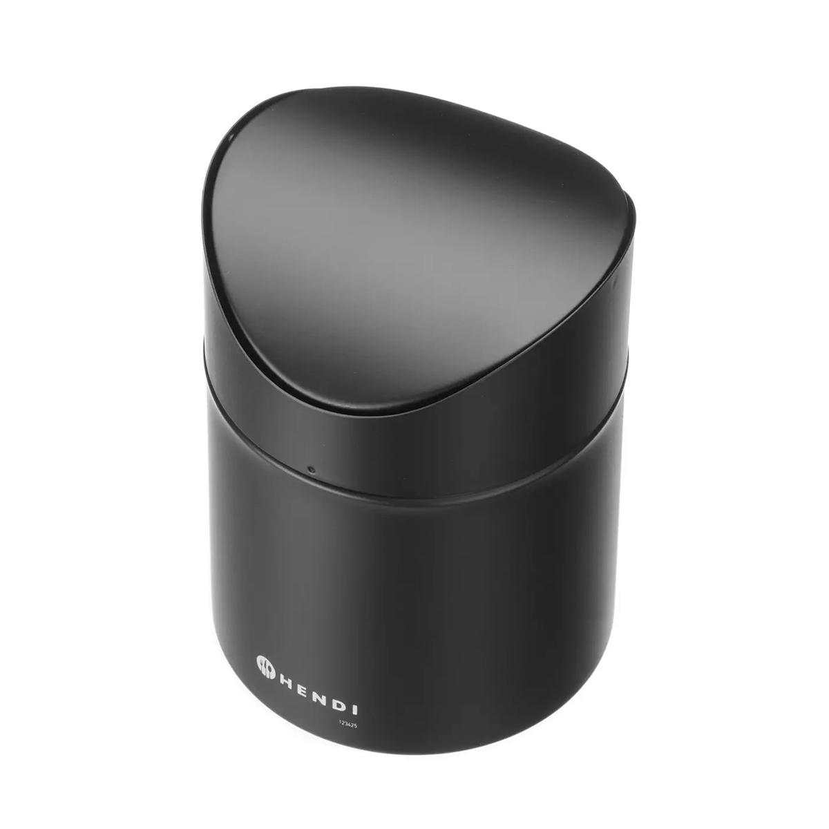 Koš na odpadky – 1,2 L – Ø 120×165 mm | Hendi 440773 je praktický a elegantní stolní koš. Matné černé provedení z práškově lakovaného kovu působí moderně a elegantně, díky čemuž se hodí do každého interiéru i exteriéru. Díky výklopnému víku pomáhá udržovat pořádek na stolech bez rušivého dojmu.