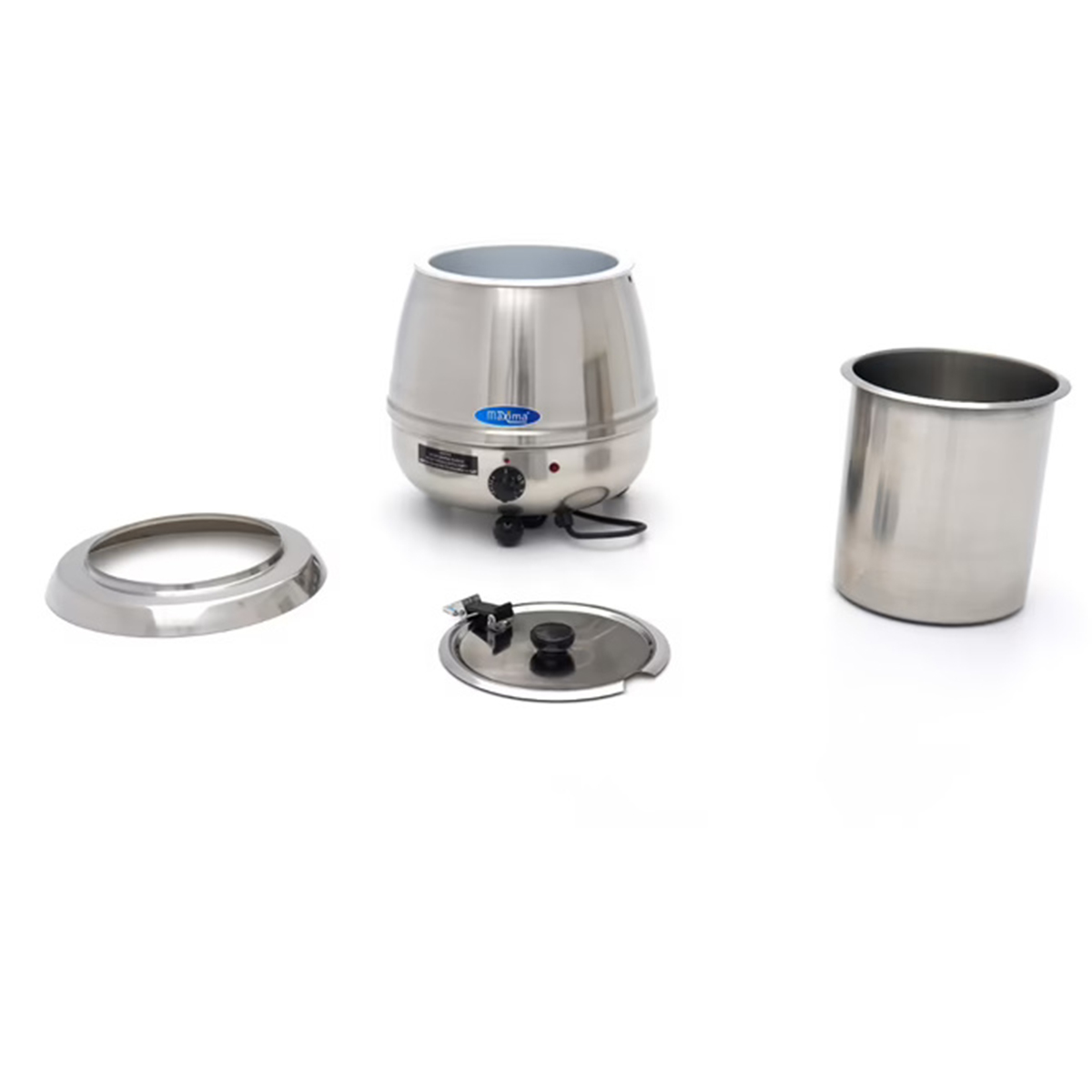 Kotlík na polévku – 10 L – stříbrný | Maxima 09306100 je profesionální a elegantní řešení pro servírování a udržování správné teploty polévek, guláše i omáček v gastro provozech. Ohřev ve vodní lázni (bain-marie) zajišťuje rovnoměrné prohřívání bez rizika připálení. Celonerezové provedení je zárukou vysoké odolnosti a dlouhé životnosti kotlíku i při každodenním používání.