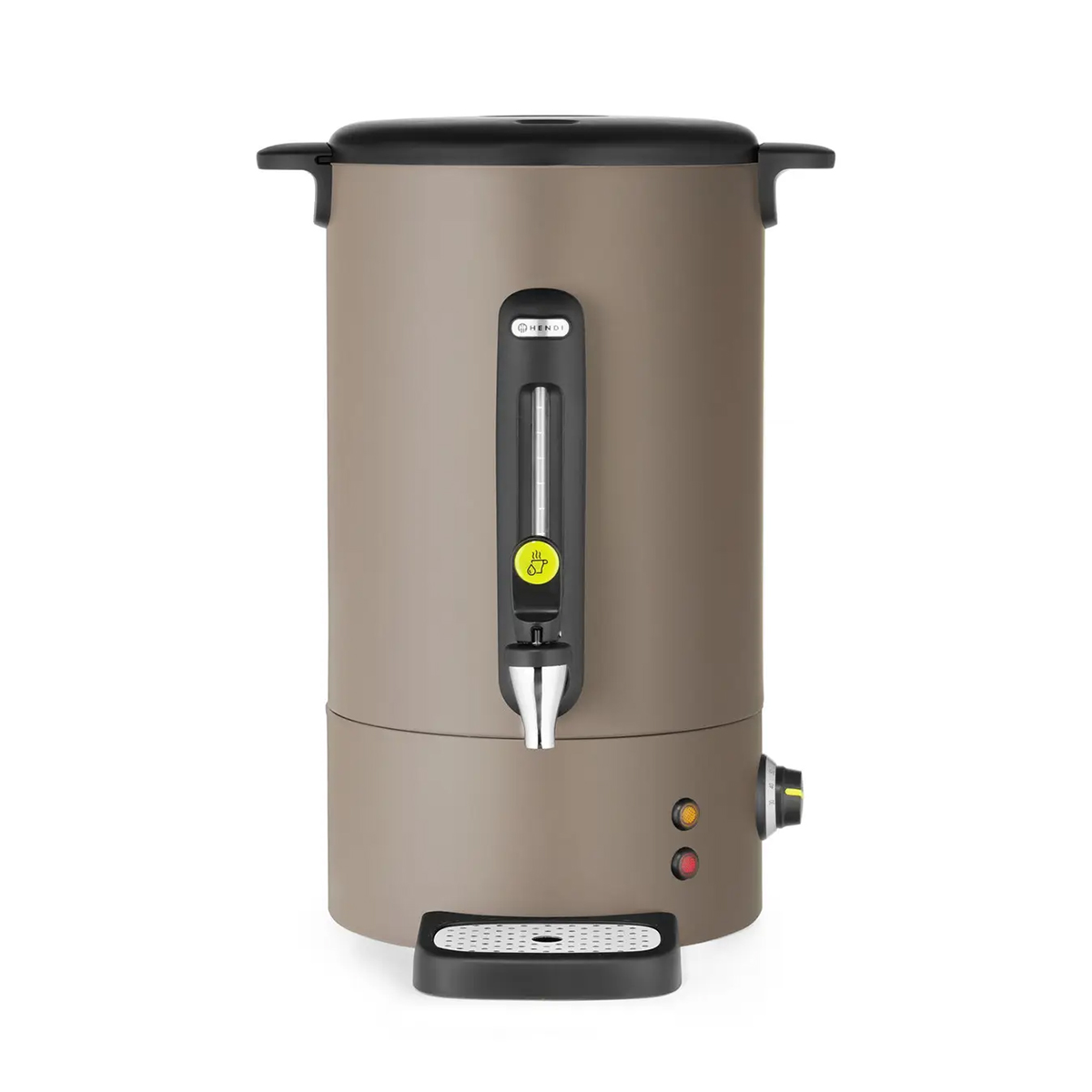 Perkolátor na kávu UNIQ – šedo-hnědý – 16 L – 1650 W | Hendi 211540 s objemem 16 litrů představuje spolehlivé řešení pro podávání kávy v bufetech, jídelnách, na firemních večírcích a dalších akcích. Perkolátor zaujme nekapkajícím kohoutkem, skleněným ukazatelem hladiny vody a magnetickou odkapávací miskou.