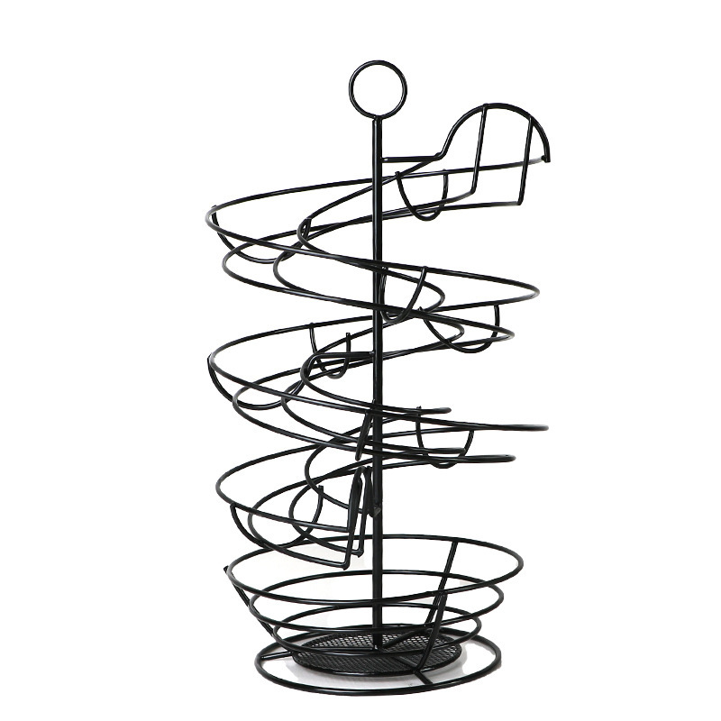 Bufetový stojan na vajíčka, ideální pro přehledné a estetické uskladnění vajec. Jeho spirálový design poskytuje efektivní využití prostoru, umožňuje rychlý přístup k vajíčkům a zároveň zabraňuje jejich rolování a poškození. Stojan je vyroben z odolného černého kovu, což zajišťuje jeho dlouhou životnost a jednoduchou údržbu. S výškou, která umožňuje uložení více vajec, je tento stojánek ideální pro domácnosti, ale i pro kavárny, bufety a restaurace, kde je třeba mít vejce vždy po ruce. Navíc jeho moderní a stylový vzhled se hodí do každé kuchyně.