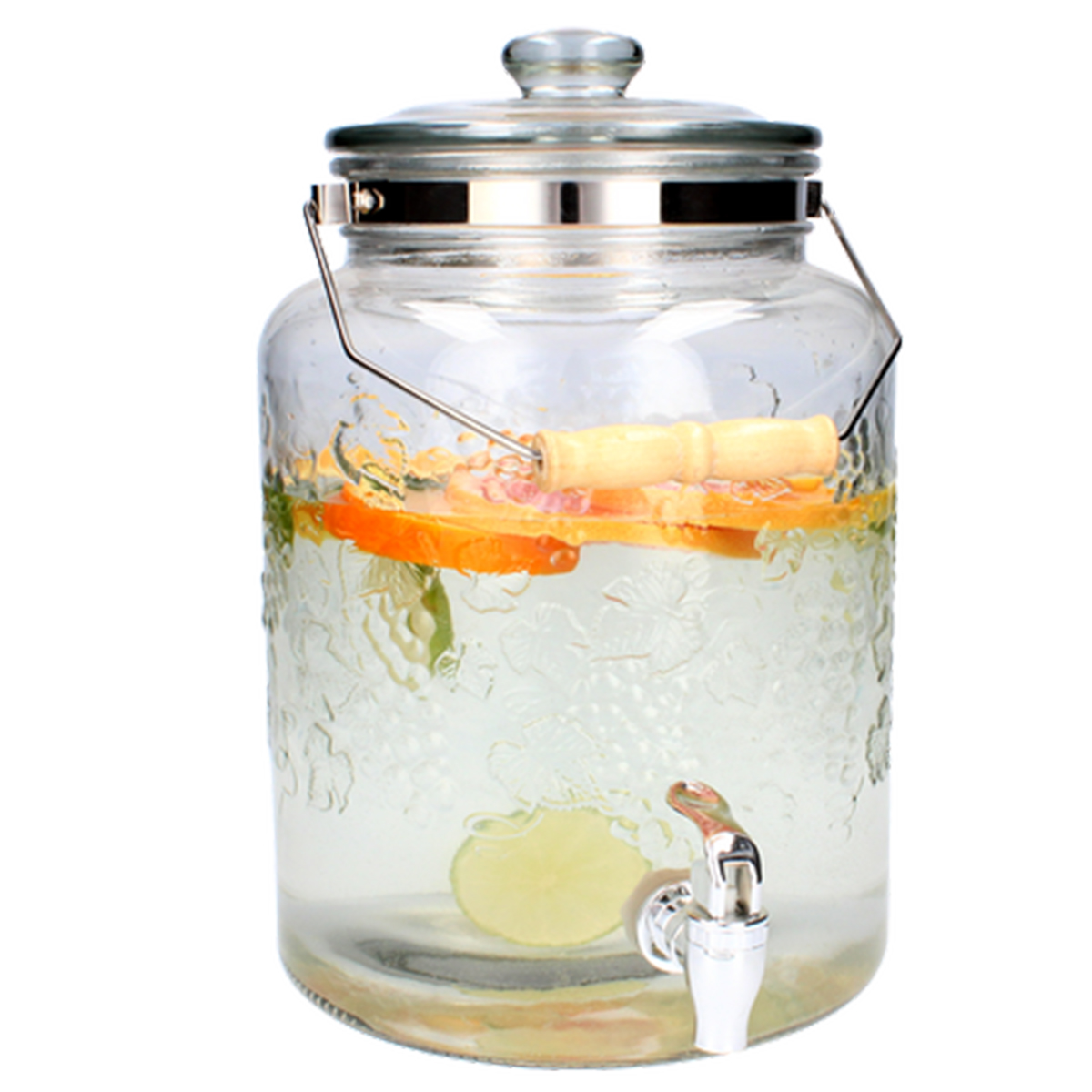 Skleněný dávkovač nápojů – 8 L je ideálním řešením pro stylové servírování limonád, džusů, osvěžujících koktejlů a dalších nápojů. Praktické těsnicí víčko chrání nápoje před vytékáním a nečistotami, zatímco kohoutek umožňuje snadné a čisté nalévání bez rozlití. Díky velkému objemu a dekorativnímu dizajnu z hrubého skla s ražbou se dávkovač stane atraktivním doplňkem každé rodinné oslavy, zahradní party nebo firemní akce. Praktický kohoutek zajišťuje čisté nalévání bez rozlití, zatímco pevná kovová rukojeť s dřevěným úchytem usnadňuje přenášení a manipulaci.