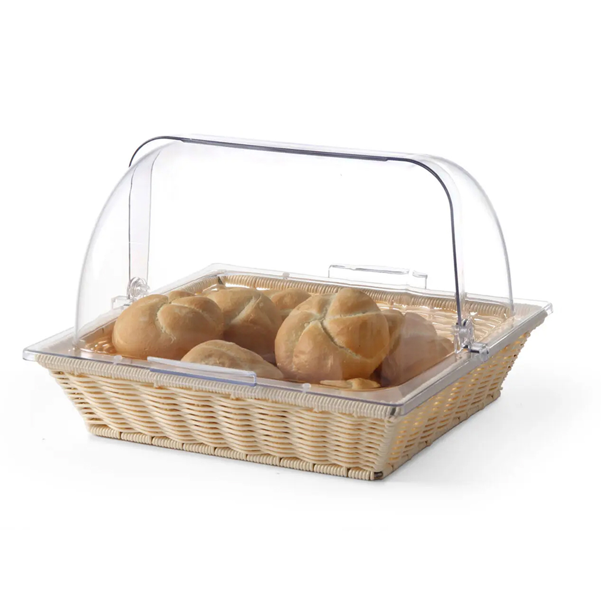 Koš na pečivo Roll top GN 2/3 – 365×365×245 mm | Hendi 426968 je elegantní a praktické řešení pro prezentaci a servírování pečiva v hotelech, restauracích, bufetech, cateringu apod. Kombinace koše z pevného polyratanu a průhledného roll-top krytu zajišťuje atraktivní vzhled, snadný přístup k pečivu a zároveň jeho ochranu před vysycháním a nečistotami.