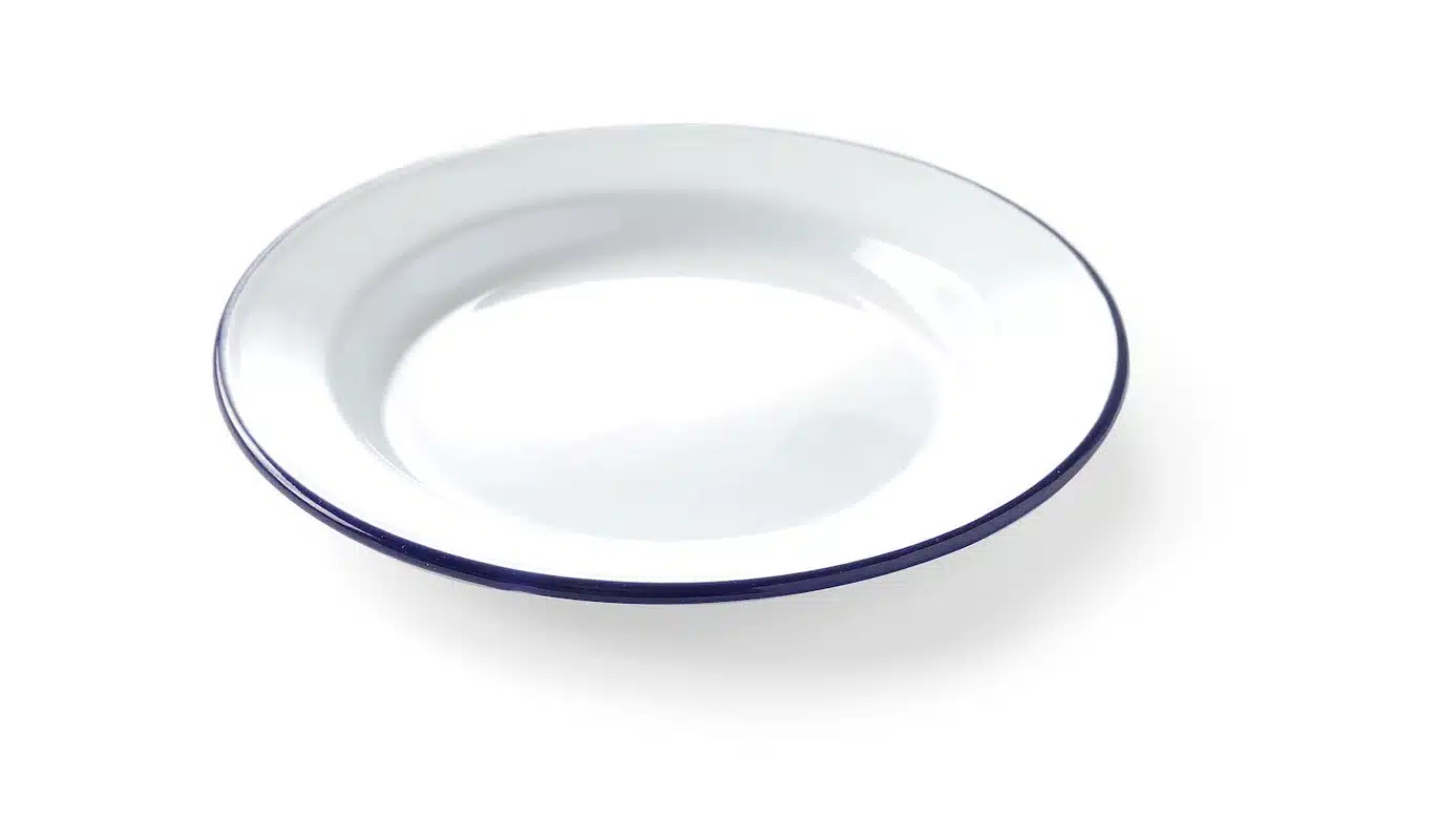 Mělký talíř – smaltovaný – Ø 240 mm | Hendi 621233 je elegantní talíř vyrobený z oceli pokryté bílým smaltem s jemným modrým okrajem.