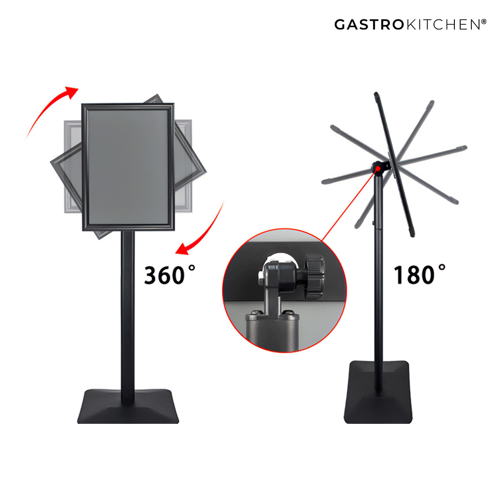 Elegantní stojan na menu A2 s robustní obdélníkovou základnou je určen pro obchody, restaurace, hotely, kavárny nebo recepce, kde je třeba přehledně a stylově prezentovat jídelní lístky, speciální nabídky nebo informační oznámení.