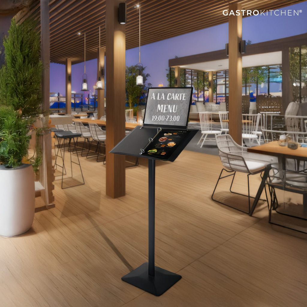 Stojan na menu s držákem na listy formátu A4 – černý | Gastrokitchen