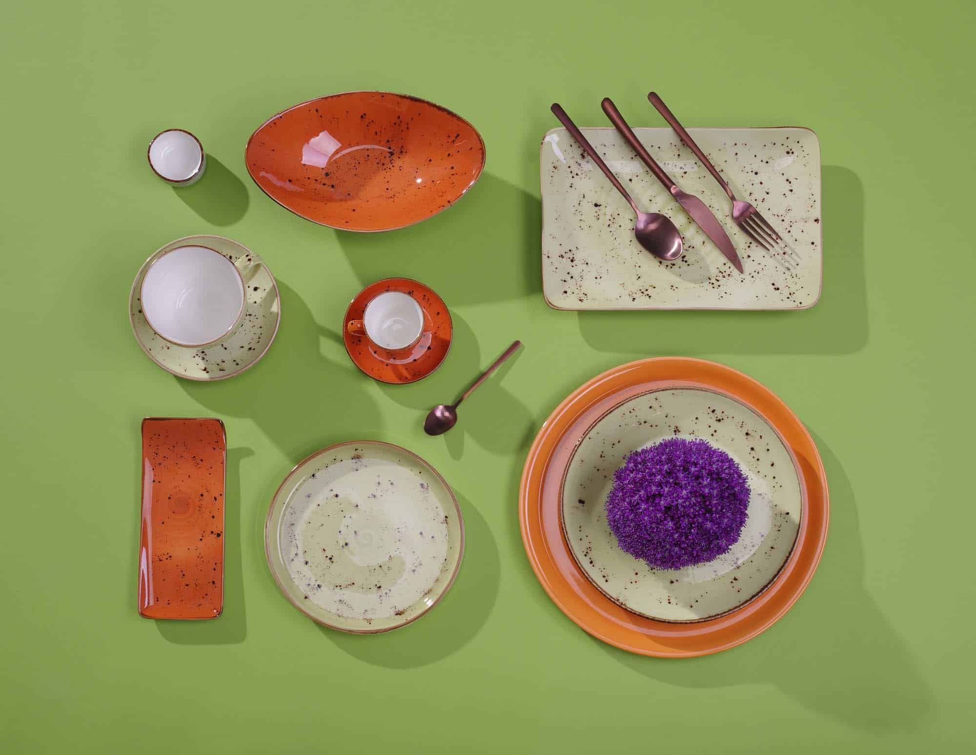 Bohatá kolekce ručně dekorovaného porcelánu ve čtyřech šťavnatých barvách. Zkombinujte oranžové, modré, tmavě modré a šedé prvky pro jedinečný a překvapující vzhled stolu, a jídlo bude vypadat stejně dobře, jako chutná. Nádobí je odolné a rezistentní, navrženo tak, aby vydrželo náročné používání v profesionální kuchyni.
