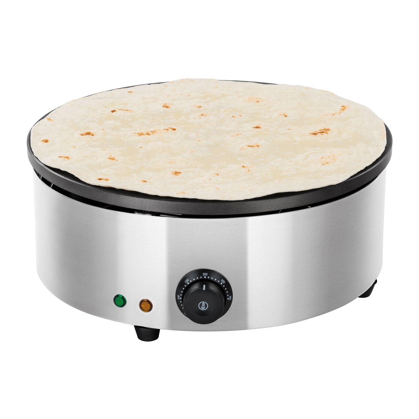 Kryt zařízení je vyroben z ušlechtilé oceli, a proto je přístroj vysoce odolný proti poškození.Opékací deska o průměru 40 cm je vyrobena z litiny potažené teflonem. Její hladký povrch umožňuje smažení bez oleje a zajišťuje snadné odstranění připravené palačinky.