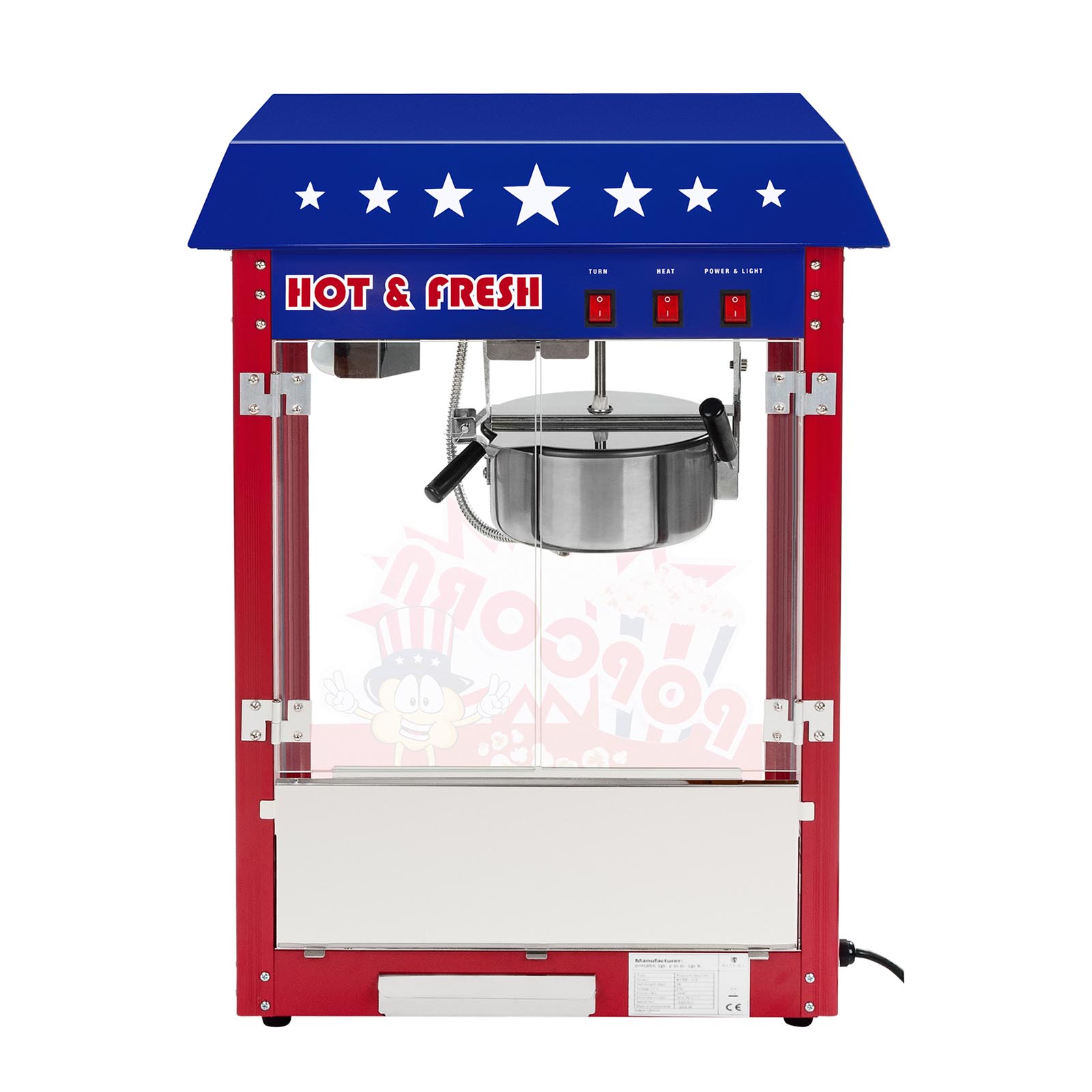 Stroj na popcorn RCPW-16.1 od Royal Catering je vhodný na profesionální použití na slavnostech, firemních akcích či trzích a dalších akcích. Vedle vyhřívané základové desky a výkonného topného elementu s 1600 watty okouzlí zejména jedinečným USA designem a červeným vozíkem. Stroj na popcorn je vyroben z vysoce kvalitního, potaženého nerez a lze ho snadno čistit. Vytížení zařízení je 16 litrů popcornu za hodinu (cca 5 kg popcornu za hodinu). Servírovací příklop na stranách vozíku zajišťuje obzvláště snadné odstranění a porcování popcornu. Na spodní straně stroje se také nachází úložný prostor navíc, ve kterém může být hotový popcorn odložený. Odnímatelný hrnec z nerez má průměr 18,5 cm. Díky teflonové vrstvě je zabráněno spálení popcornu. K tomu se ještě snadno čistí a dá se tak rychle znovu použít. Díky atraktivnímu americkému designu a ozdobné nálepce upoutá tento stroj pozornost.