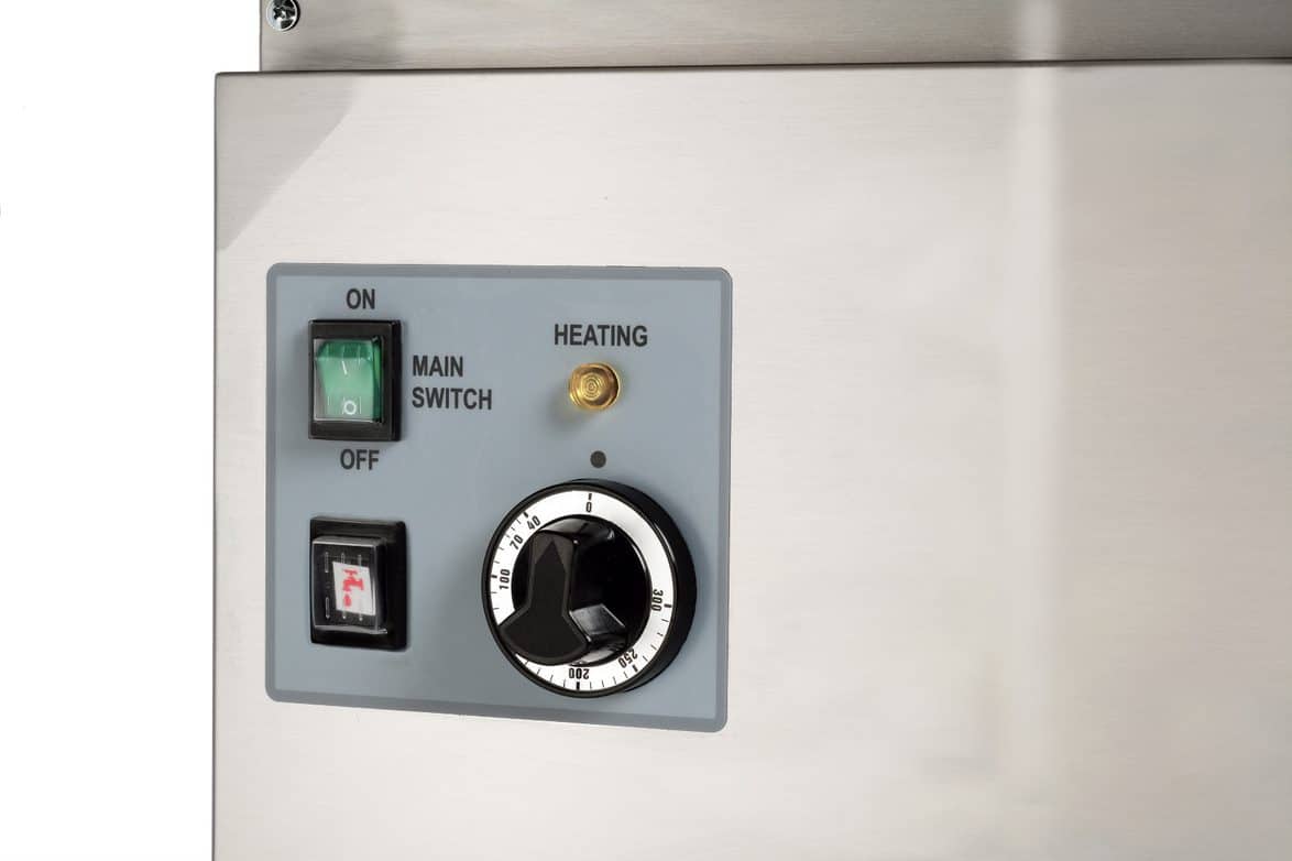 - pánev je vybavena pracovním termostatem pod čelním krytem v elektrické skříňce upevněné na nosném rámu