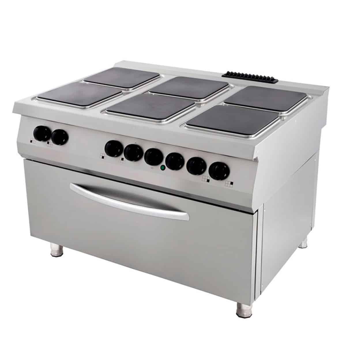 Elektrický sporák Premium se 6 hořáky a širokou troubou je profesionální a exkluzivní sporák. Tento odolný elektrický sporák je určen k intenzivnímu používání a jeho ergonomický design zpříjemňuje práci. Pouzdro je kompletně vyrobeno z nerezavějící oceli, takže se snadno čistí. Litinové varné desky jsou hermeticky uzavřeny a tvoří v horní části jeden celek.