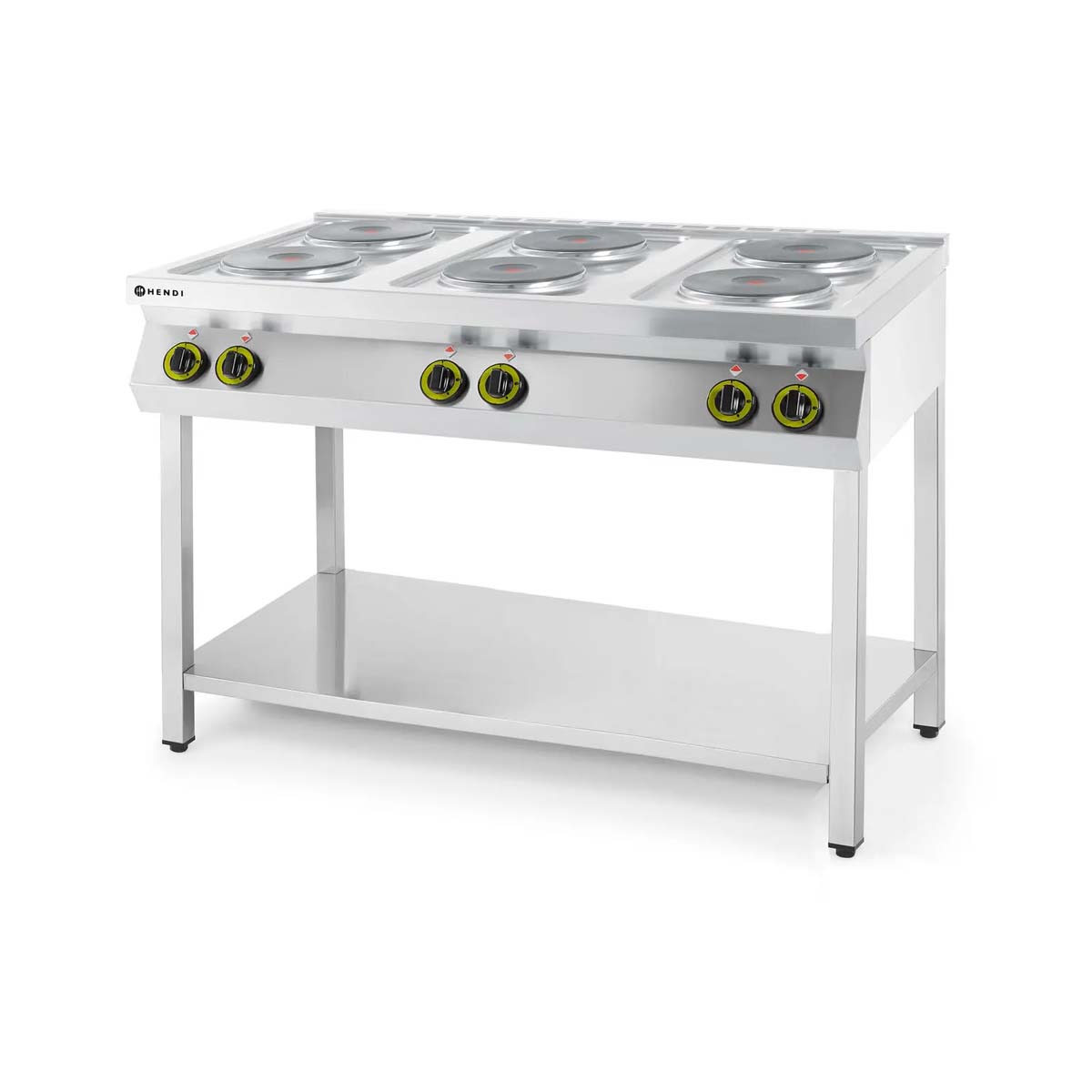 Elektrický sporák HENDI, se šesti plotýnkami na otevřeném podstavci. Spotřebiče řady Kitchen Line vynikají svojí spolehlivostí, ergonomií a kvalitním nerezovým provedením. Díky své univerzálnosti najdou uplatnění v jakékoli kuchyni.
