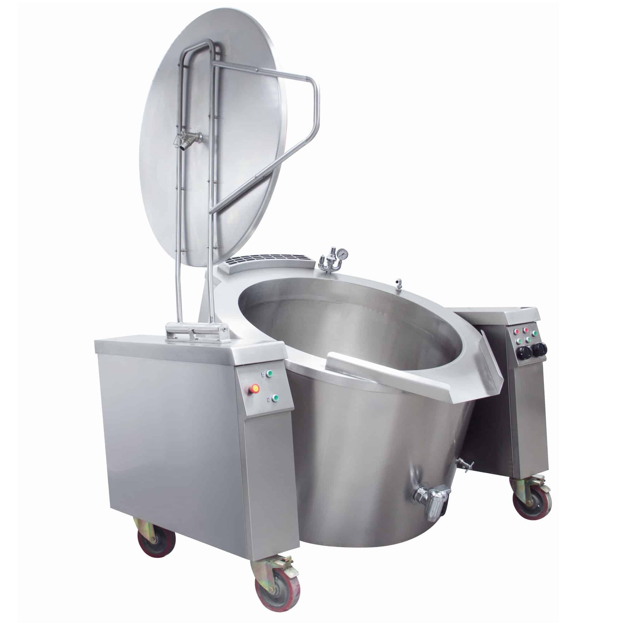 Varná pánev je automatická sklopná varná pánev o objemu 150 l a je ideální pro vaření, pečení nebo pošírování jídla. Výklopná varná pánev má bezpečnostní pojistku proti otevření víka při naklonění pánve. Pánev můžete naklonit pomocí jednoduchého ovládacího panelu. Tato varná pánev má dvojitou stěnu, kterou lze naplnit vodou; jde o nepřímý topný systém, který zajišťuje rovnoměrný ohřev spodní a boční jamky varné konvice. Protože je sklopná varná pánev kompletně vyrobena z nerezavějící oceli, je její čištění snadné.